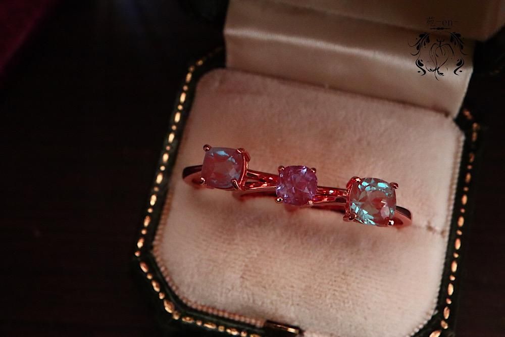 3種類のアンティークのクッションカットサフィレットをシンプルなリングに留めました。