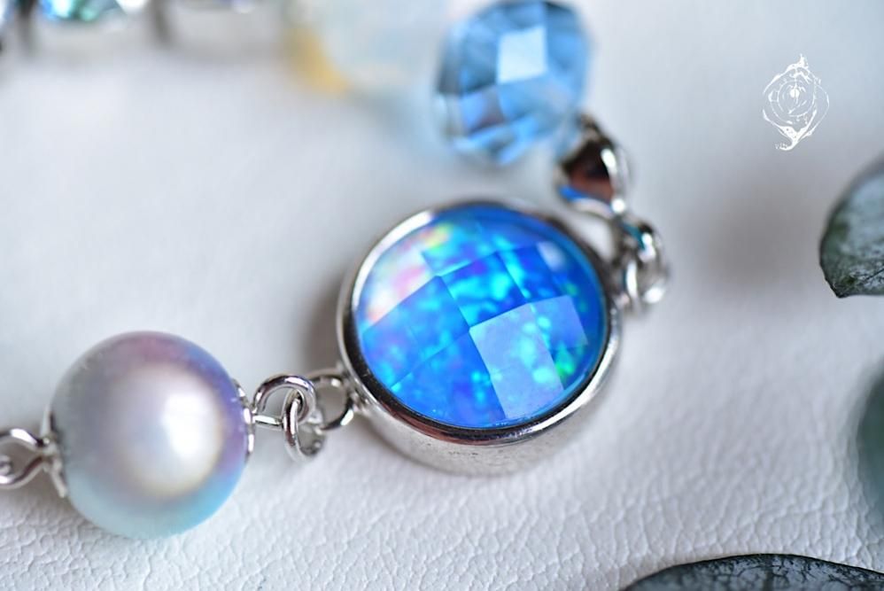 清涼感あふれる空色のネモフィラをモチーフに、スワロフスキーや人工オパール不思議な質感のビーズなどを並べ、かわいらしく仕上げました。