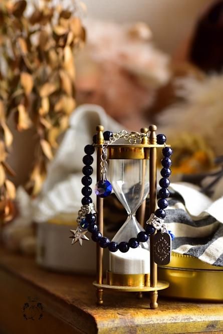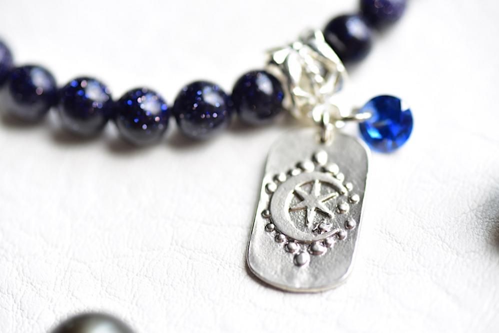満天の星をぎゅっと濃縮したような、奥行きある輝きが印象的な人工ブルーサンドをぐるりと一周取り巻くブレスレットにしました。