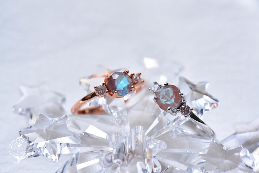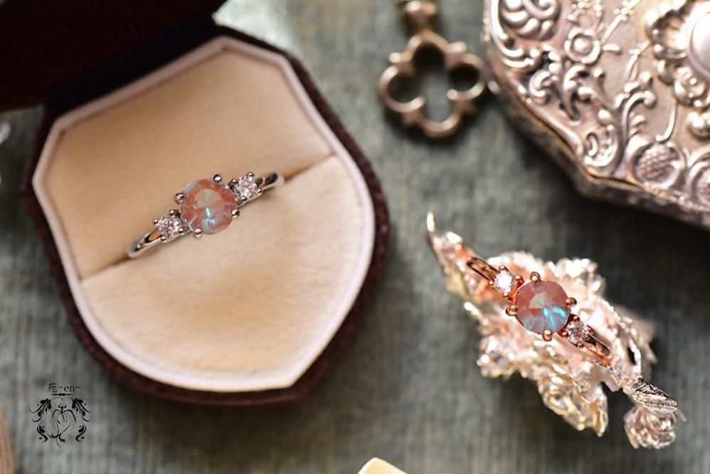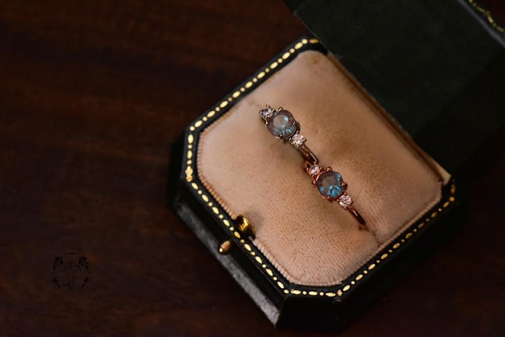 ピンクゴールドのリングに留めた方が若干青が濃いです。