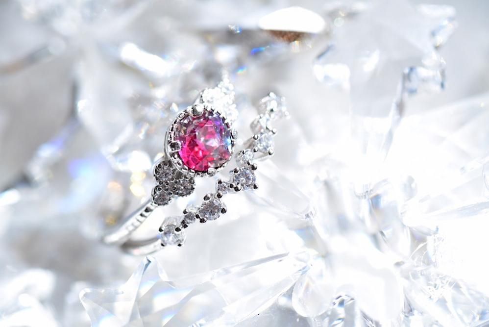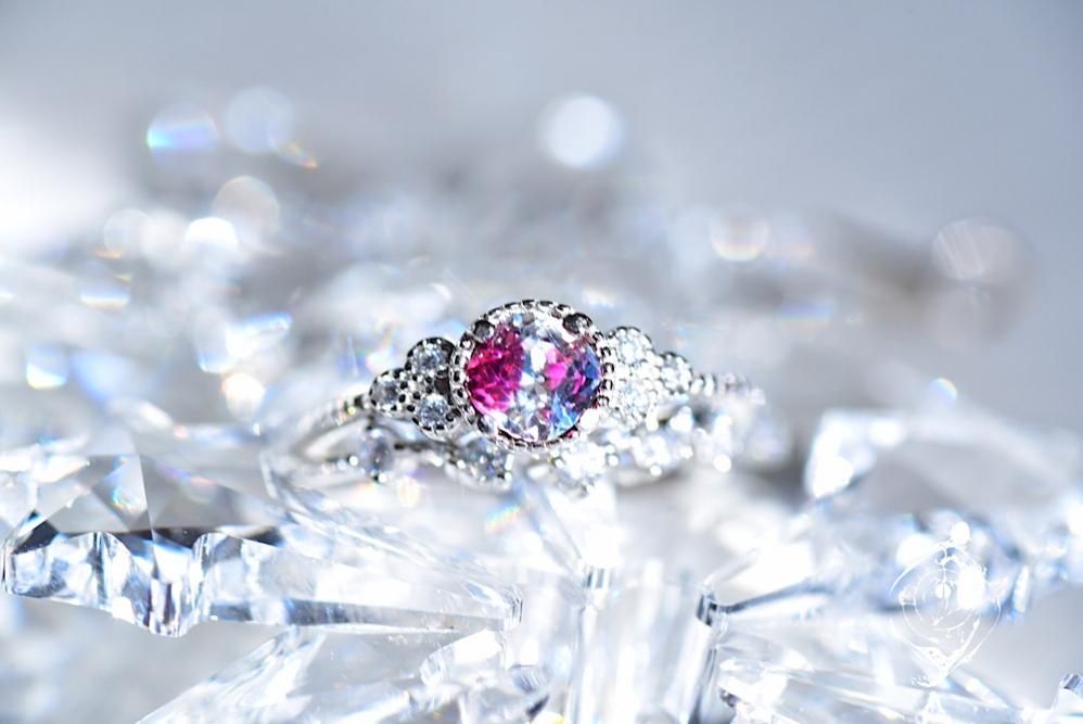 アイリスガラスはクリアとわずかな青と濃淡のピンクが織り交ざる、キュートな輝きを放つ美しいクッションカットのルースを使用しています。