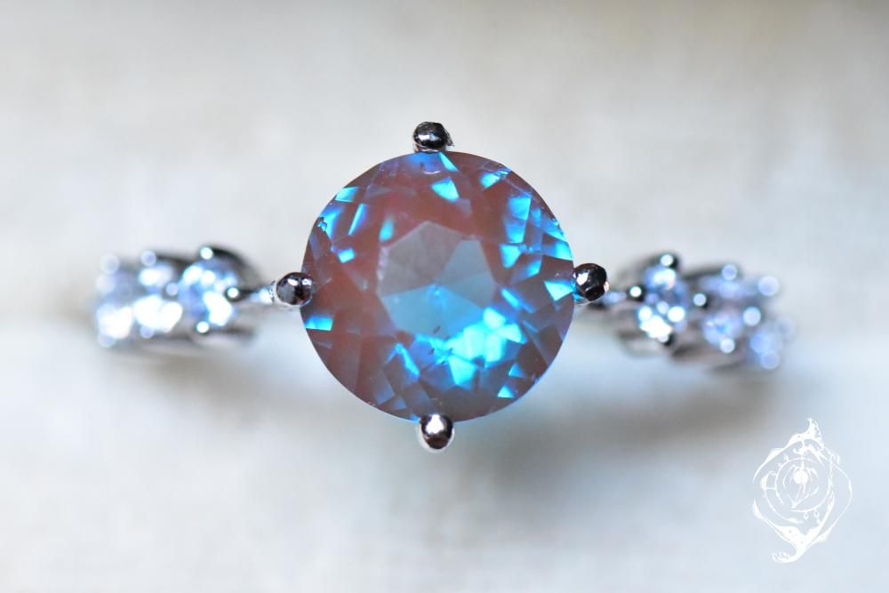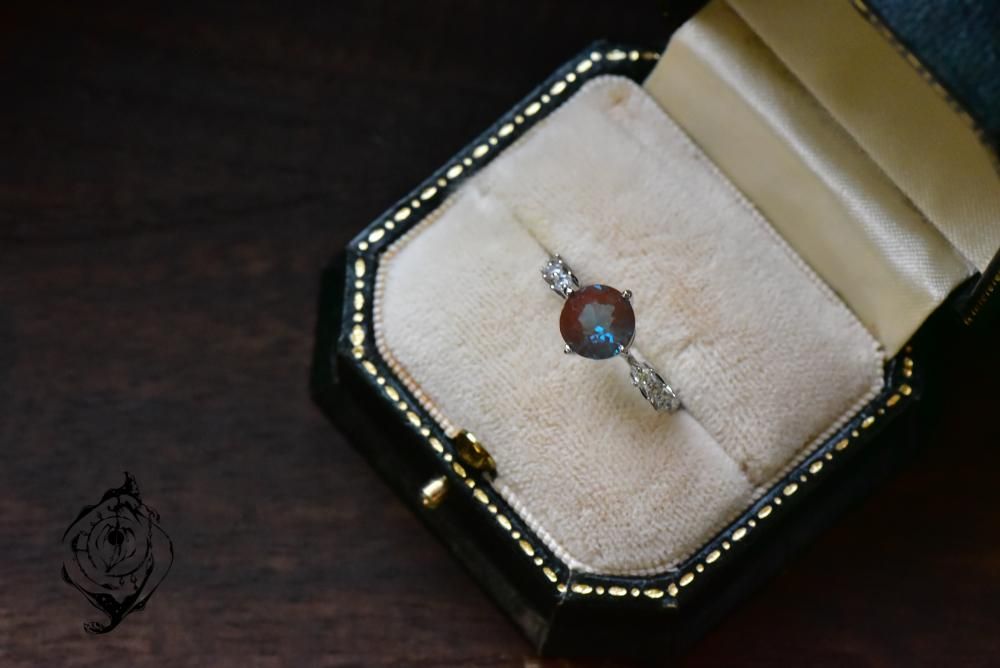 非常に深い青のラウンドサフィレットを、アームにキュービックジルコニアが輝くリング台に丁寧に留めました。