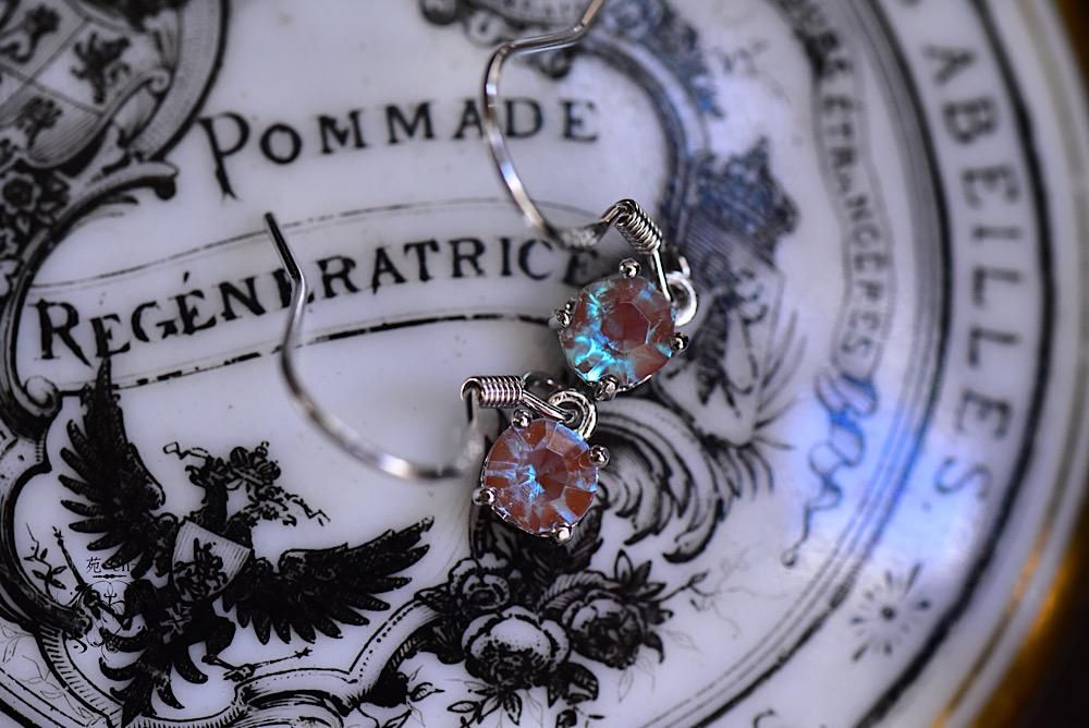 こっくりとした青が印象的なサフィレットを、耳元で細やかに揺れるフックピアスに留めました。