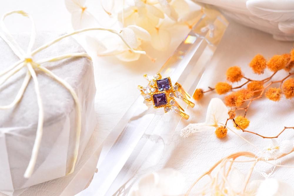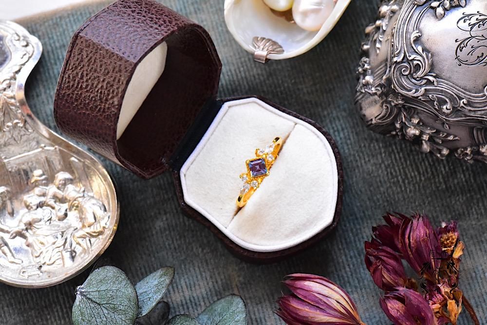 スクエアの合成アレキサンドライトを華やかなリングに留めました。