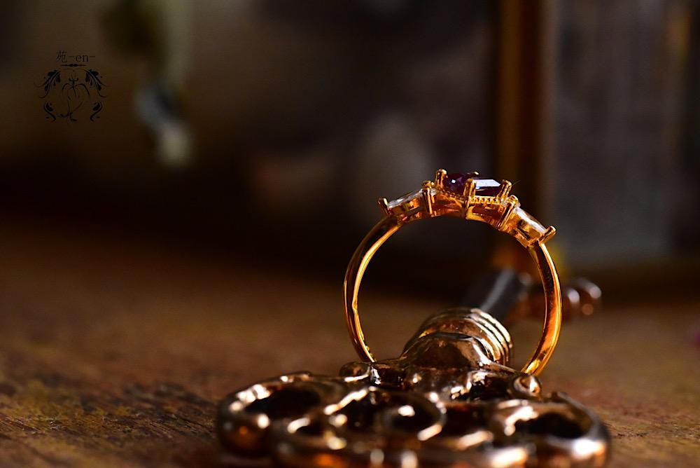石の脇にアイビーの葉の様に配置されたキュービックジルコニアと、石の回りをぐるりと囲うようなミル打ち風の枠が大人なかわいさを表現しています。
