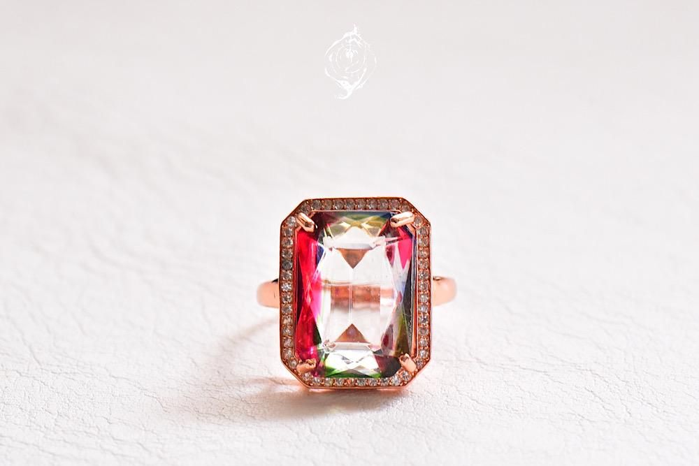キュービックジルコニアに囲われたリング台に、ヴィンテージ西ドイツ産の端に色がある特徴的なアイリスガラスを留めました。