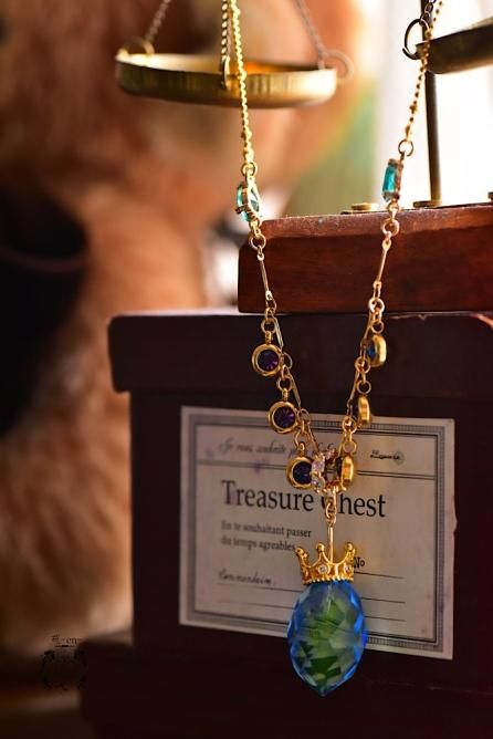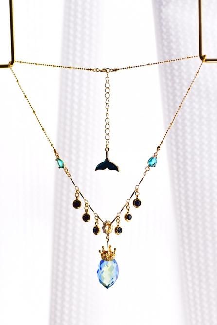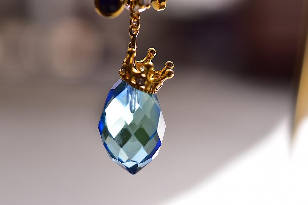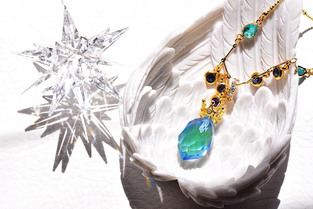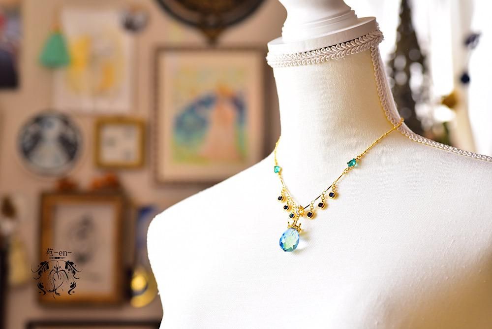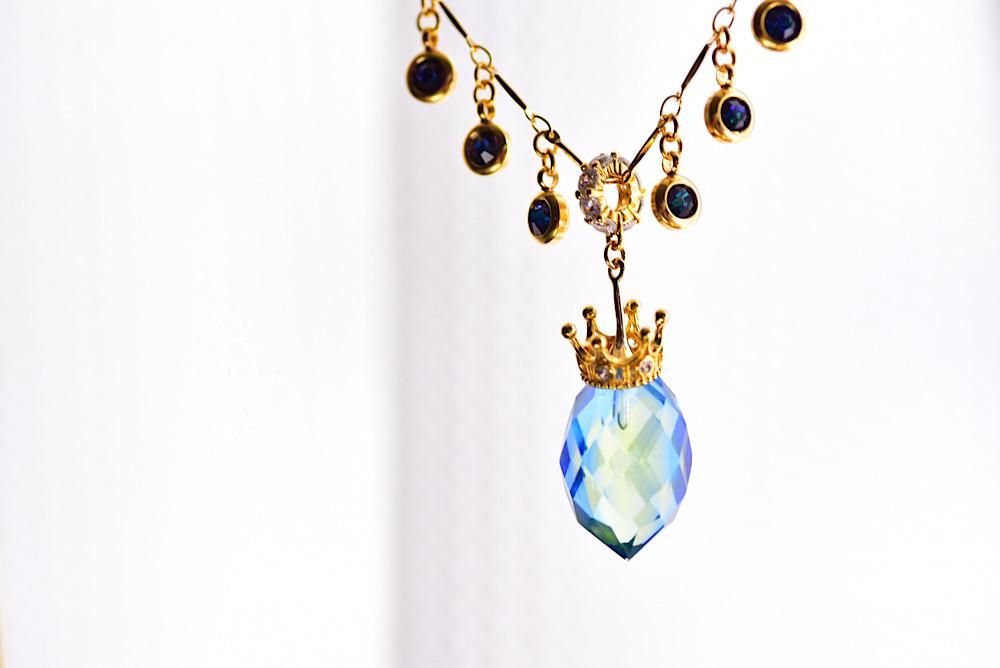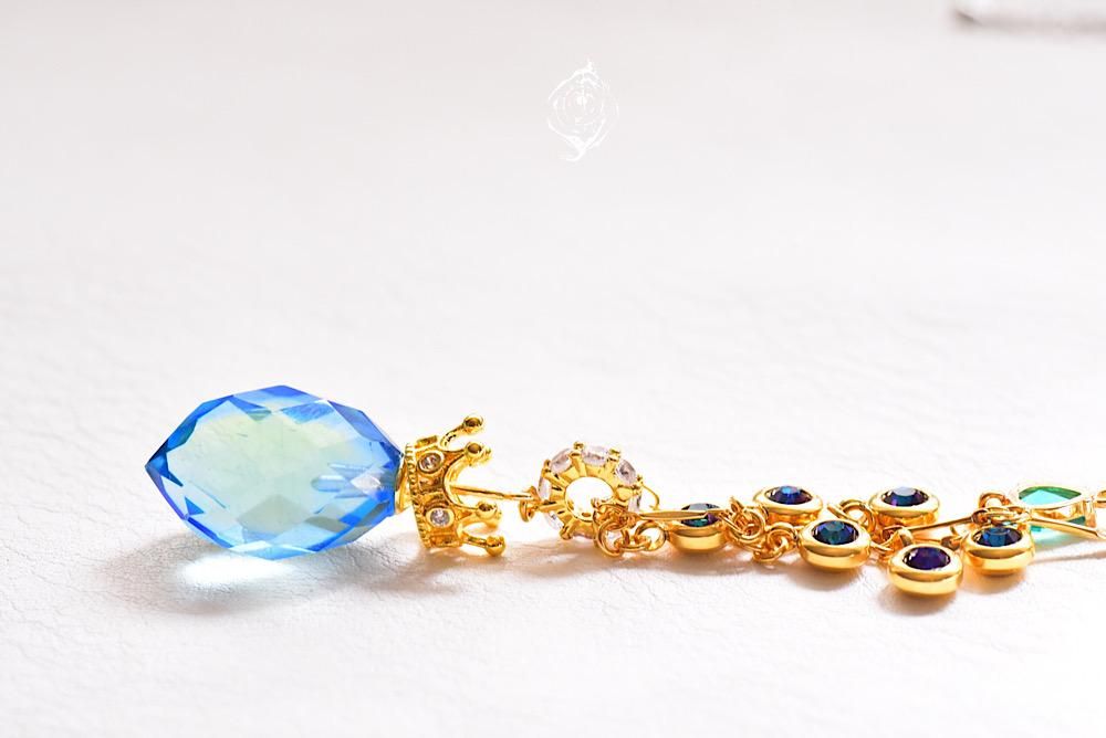 バチカン部分はキュービックジルコニア、チェーン部分に揺れる6つの深い青はVnt.スワロフスキーのバミューダブルー、エンドパーツにはテールモチーフのチャームを使用しています。