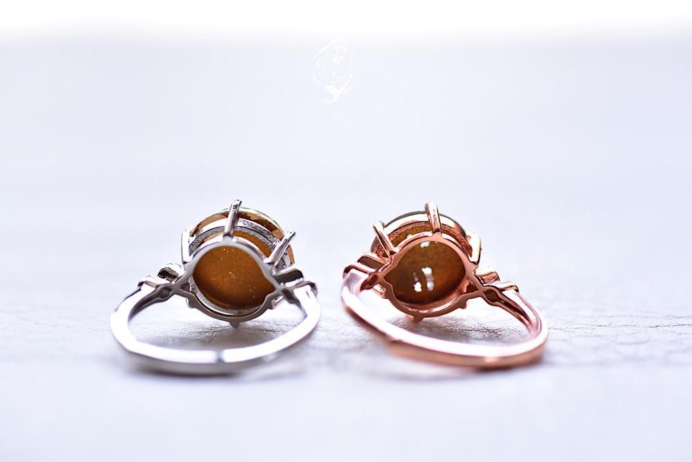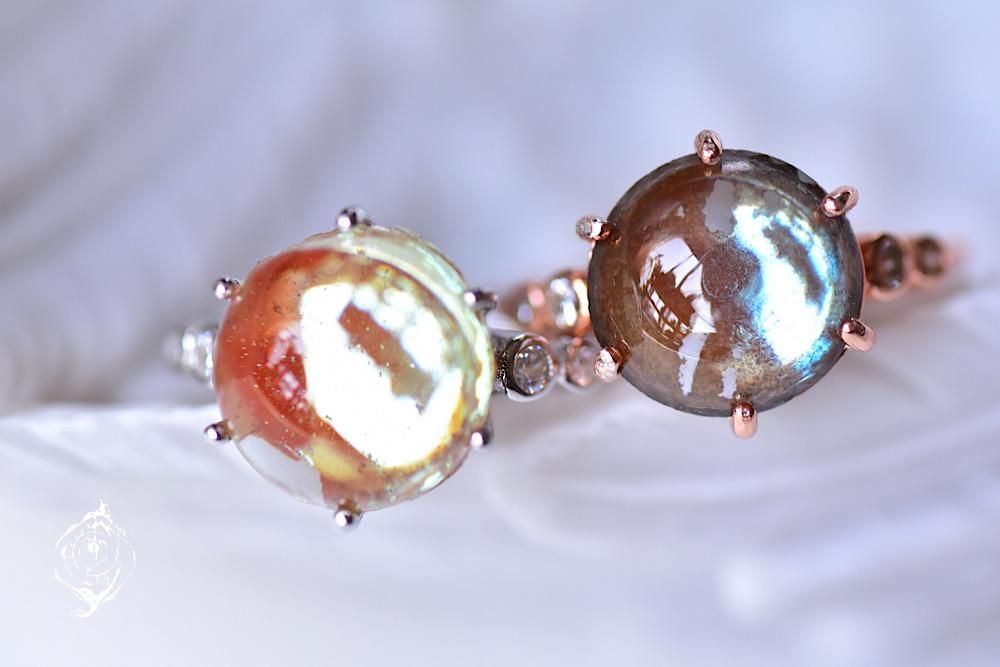 シルバーの方はミントグリーン(11mm)、ピンクゴールドのほうはグレーを帯びたブルー(10mm)のルースを使用しています。