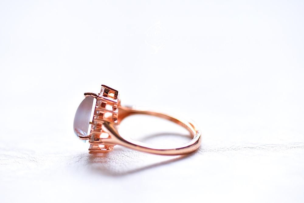 早朝の霧の中のようにぼんやりと淡い水色が清涼感あるフロストサフィレットのリング。