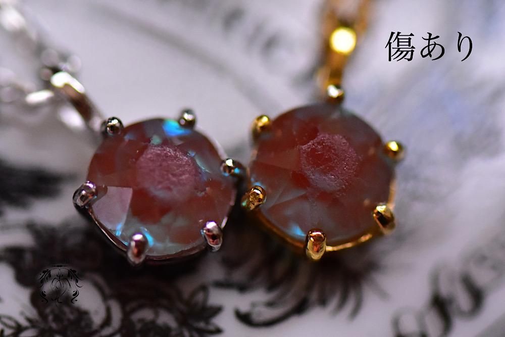 傷がない方も全く無傷というわけではありません。肉眼では無傷のように見えますが、ルーペで確認すれば極々わずかに存在したりします。またピンクゴールドに留めたルースには気泡が1つ内包されており、肉眼では小さな黒い点に見えます。しかし正面から見たときに正円に近く、これから経年変化をスタートさせる素晴らしい状態といえます。