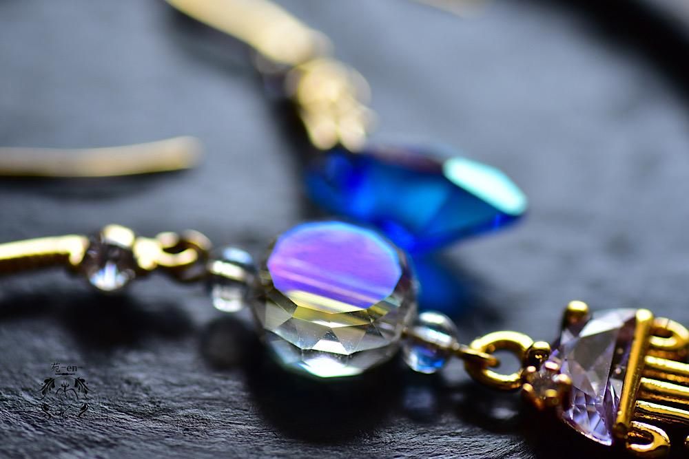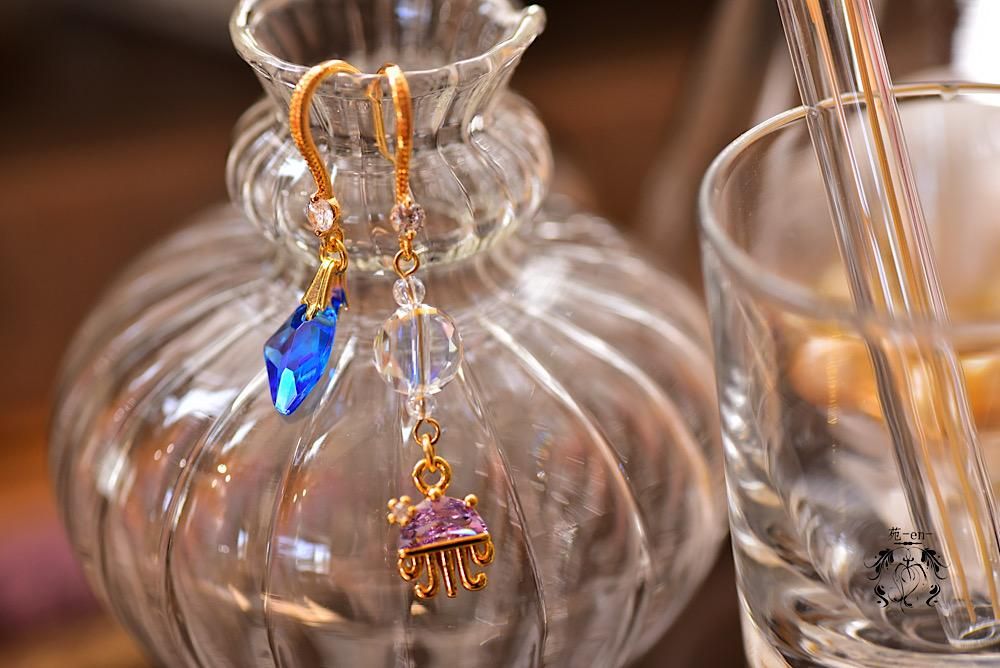 キュービックジルコニアのクラゲと鮮やかな青い海を彷彿させるアクリルチャーム、海中を上る泡のようなビーズが涼やかな様相です。