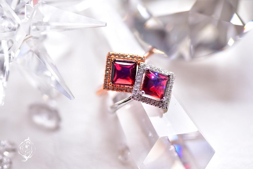 つるんとしたルース全体に紫の大きなシターが揺らめく妖艶なドラゴンズブレスを、キュービックジルコニアに囲まれたリングに留めました。