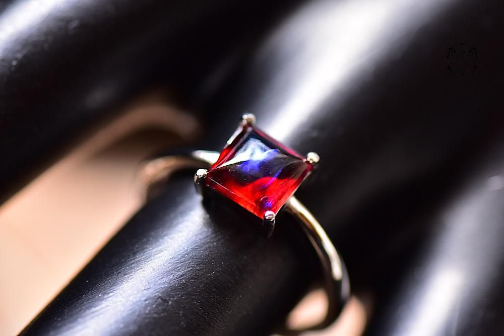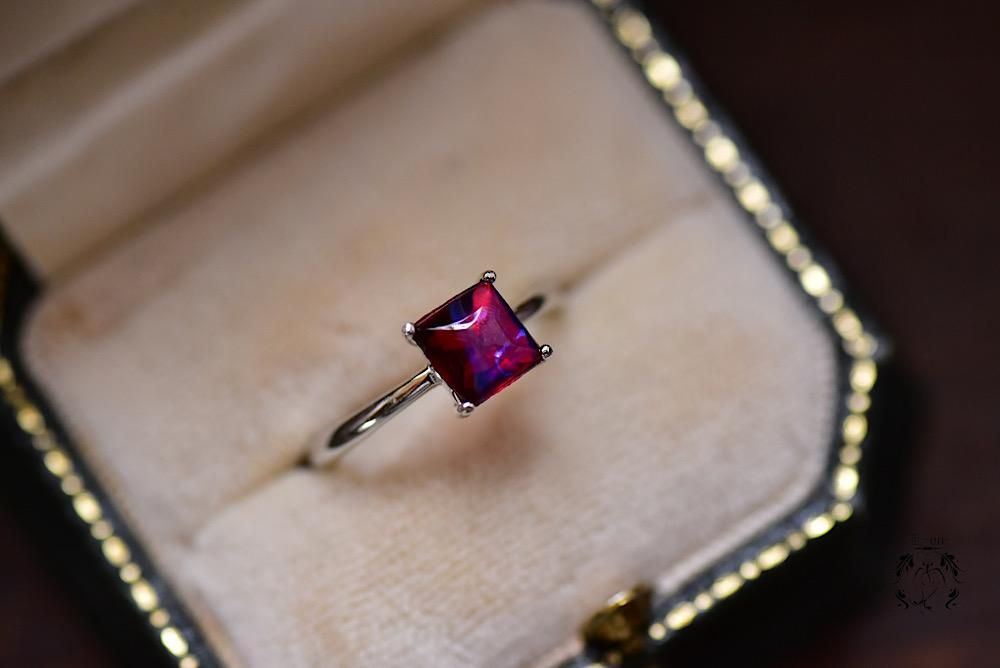 つるんとしたルース全体に紫の大きなシラーが揺らめく妖艶なドラゴンズブレスを、シンプルなリングに留めました。