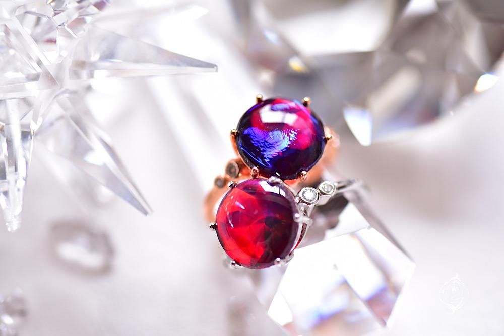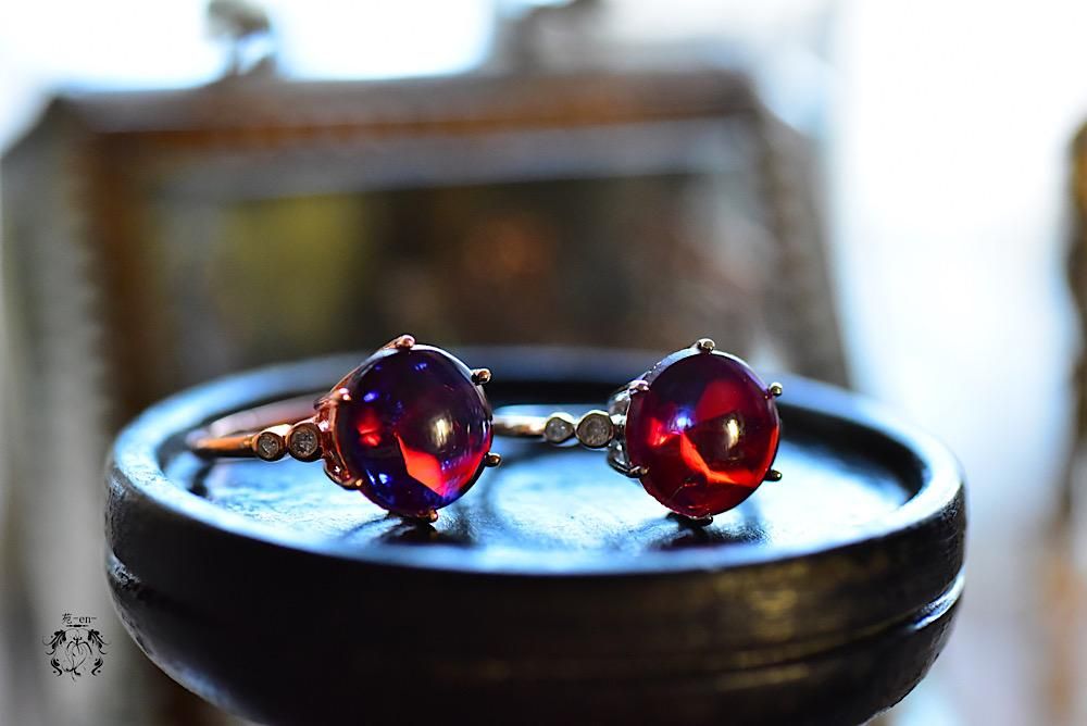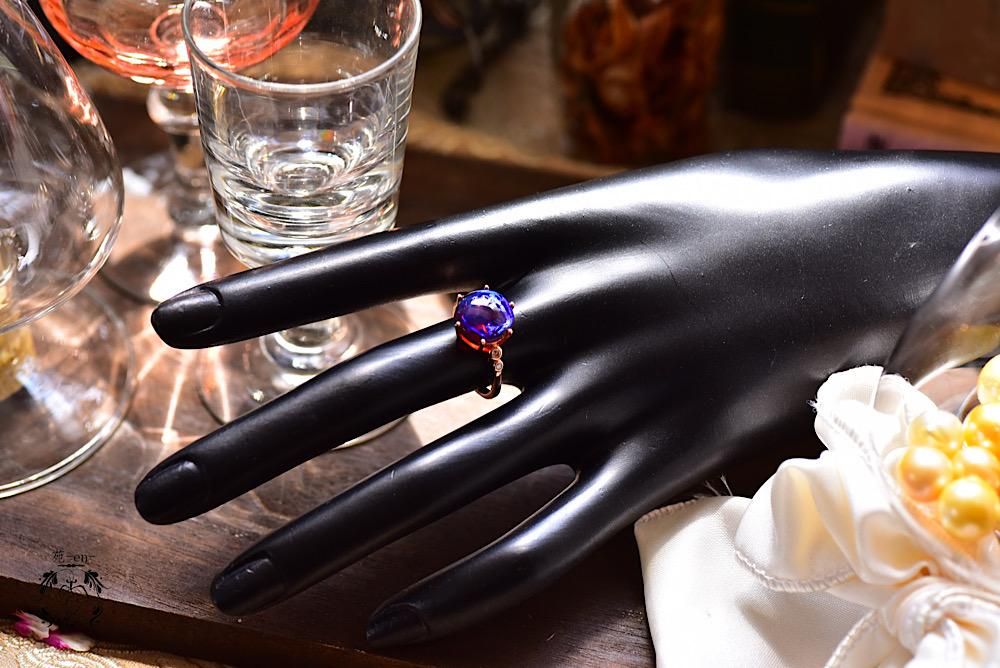 つるんとした大きいサイズのルースに紫の大きなシラーが全面に揺らめく妖艶なドラゴンズブレスを、シンプルなリングに留めました。