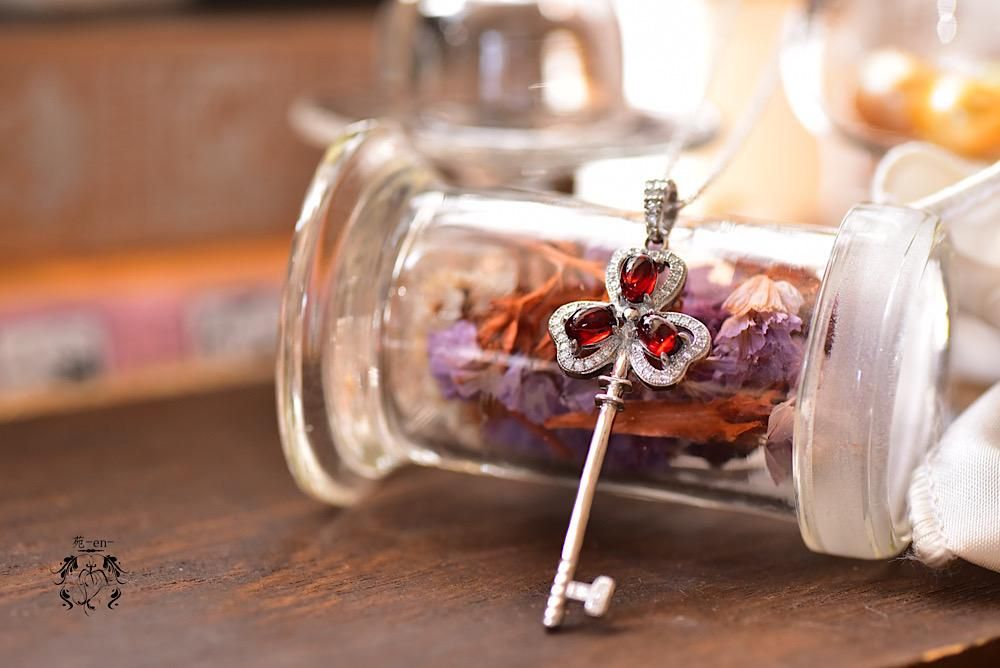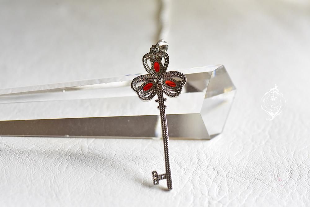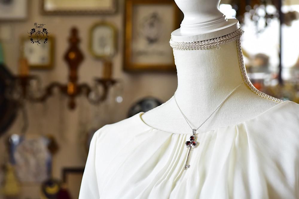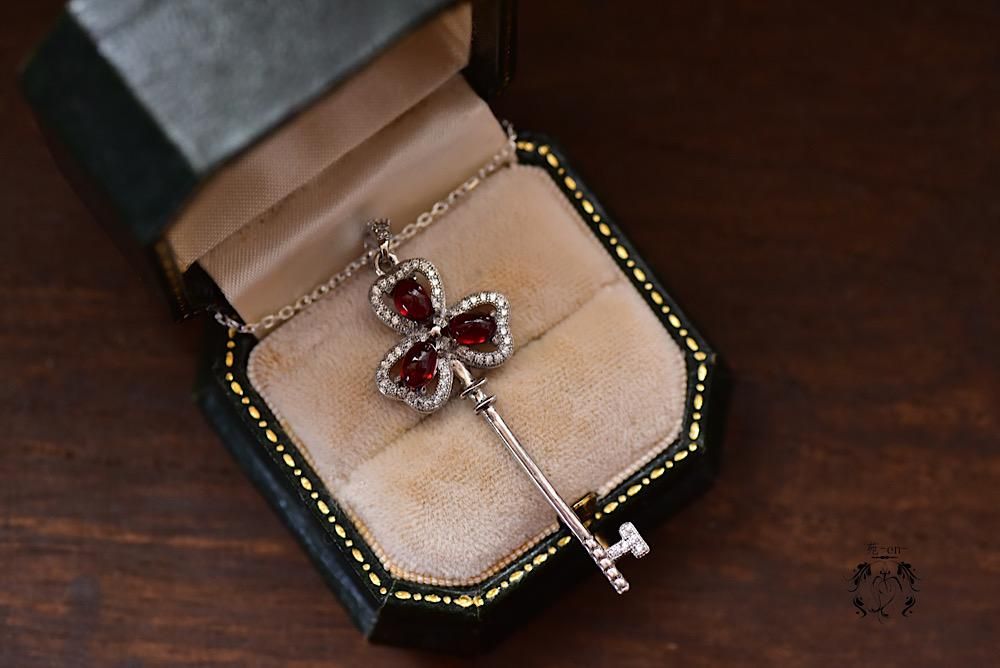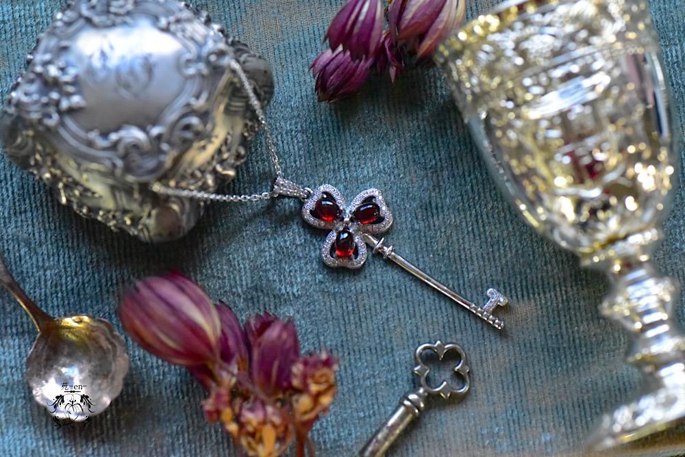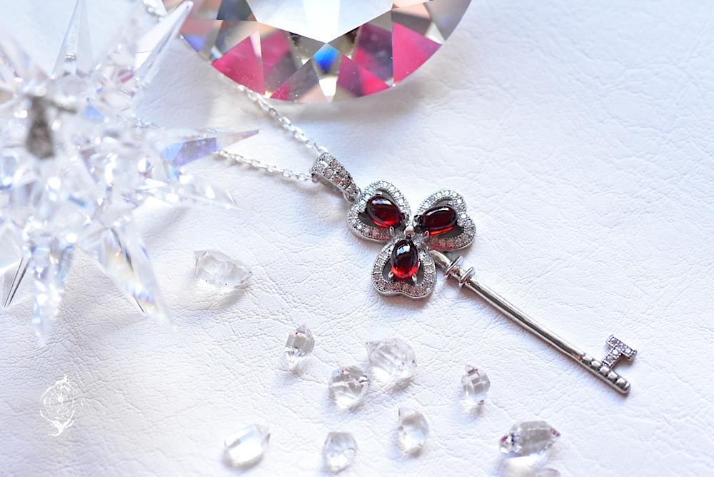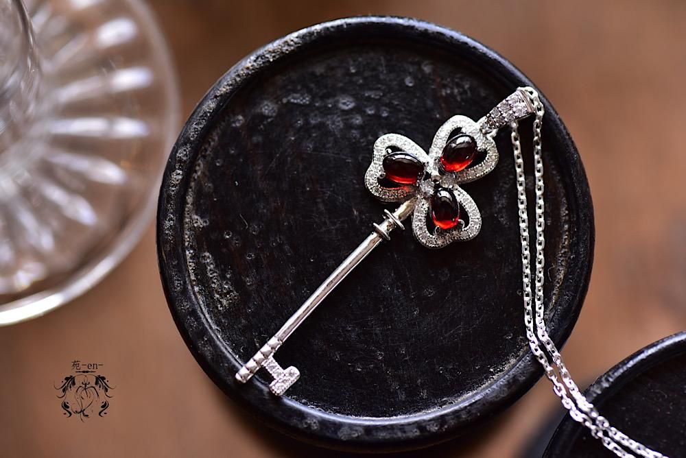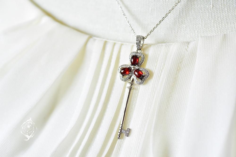 ぷっくりとした深紅のガーネットを、幸運のモチーフシャムロックの鍵モチーフに合わせたネックレス。