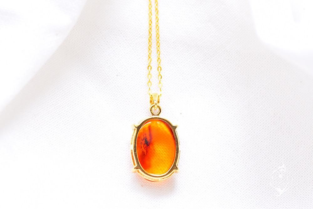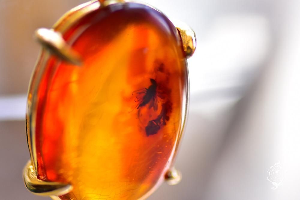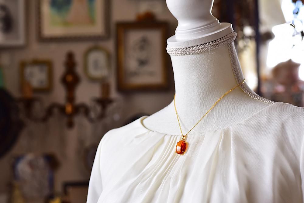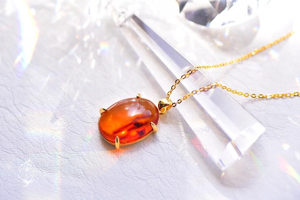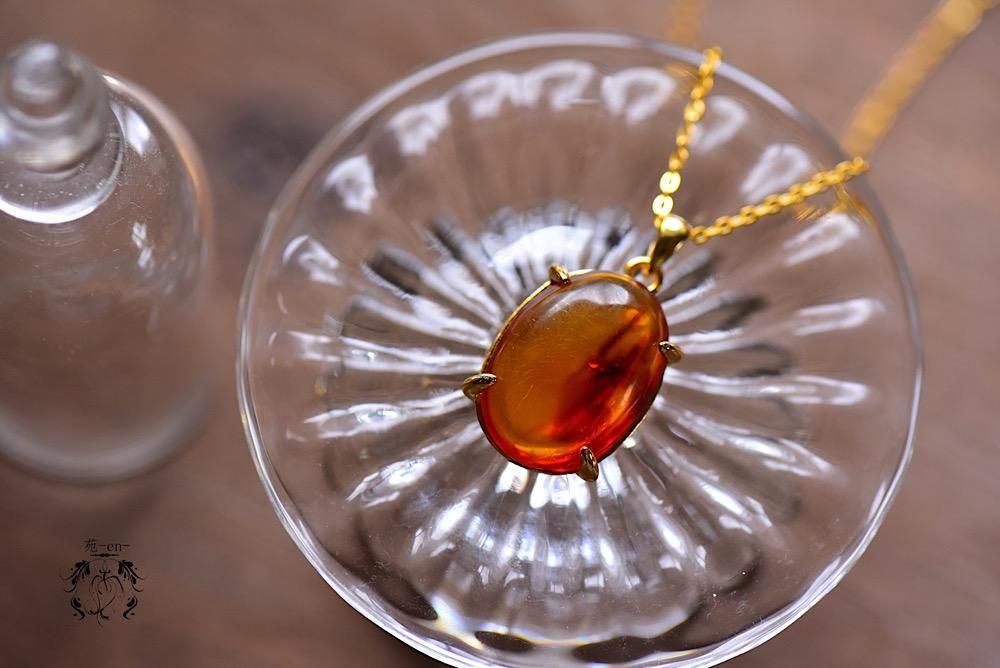 優しい飴色のなかに羽虫が完全な状態で1匹封じられている琥珀のネックレス。