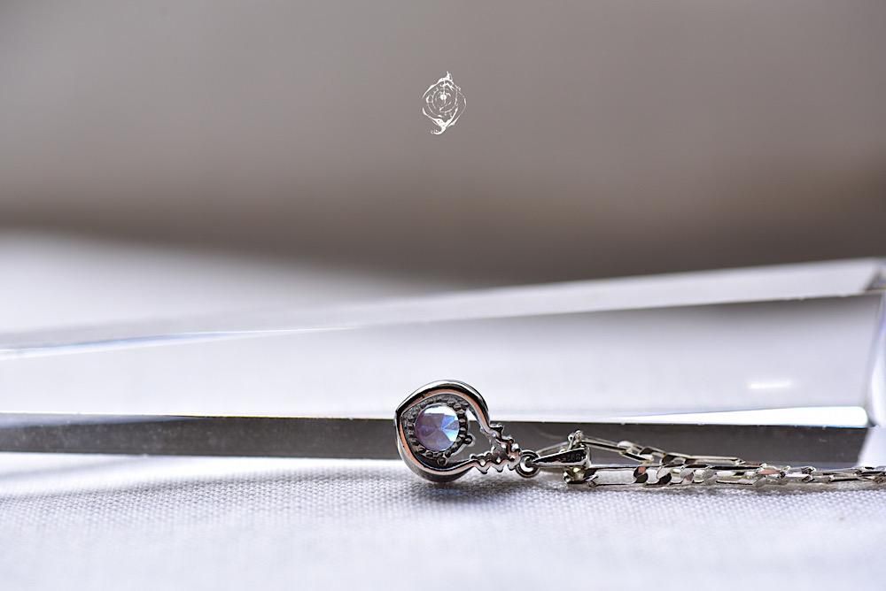 スレや摩耗がほとんどなく、状態の良さはまるでデッドストックのようです。しかしこちらは破損したペンダントトップから取り出したものなので、大切にしまわれていたのかもしれません。高さがあまり高くないためか、ごくわずかに背景色に影響を受けます。しかしどんなカラーの背景でも青の閃光がなくならないのは素晴らしいルースゆえであると感じます。ハンドカットのため正円ではなく左右非対称です。