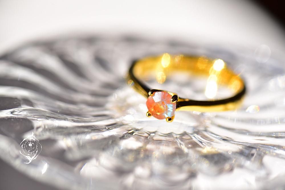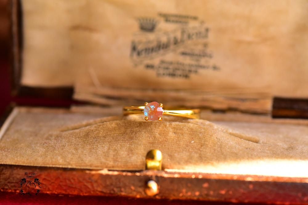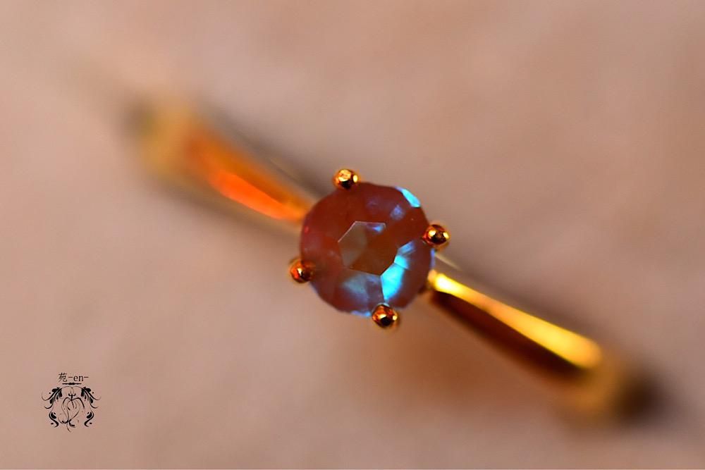 ハンドカットのため左右非対称で正円ではありません。全体的にまろやかな色の出方をしています。レンガ色よりはモーブカラーといった方がしっくりくるお色で、その中にシアンカラーの閃光が走ります。欠けやチップがほとんどなく状態は良いルースです。