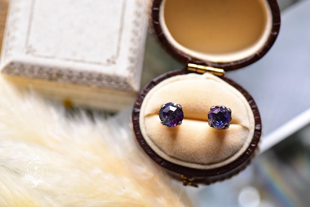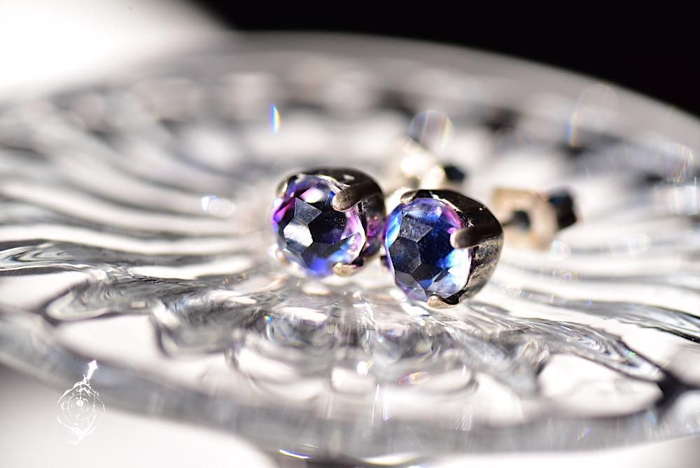 1920年代フランス製のバックフォイルがないアイリスガラスを、シャビーシックな銀古美のピアス台に留めました。