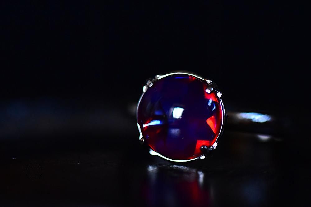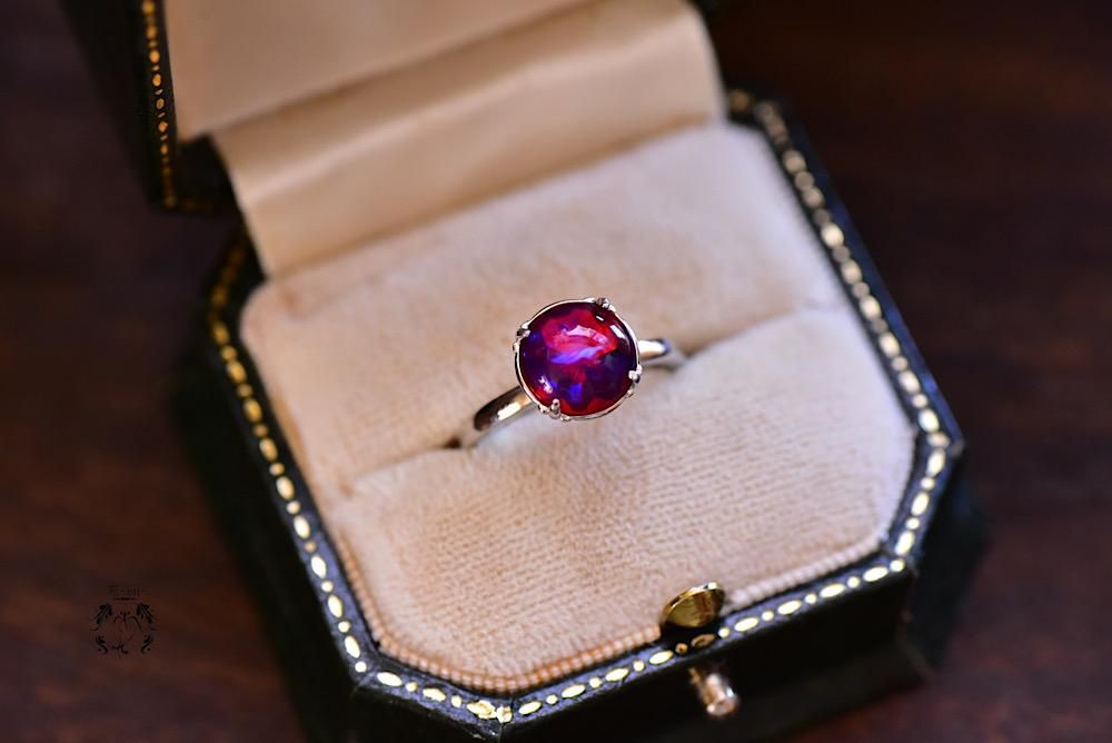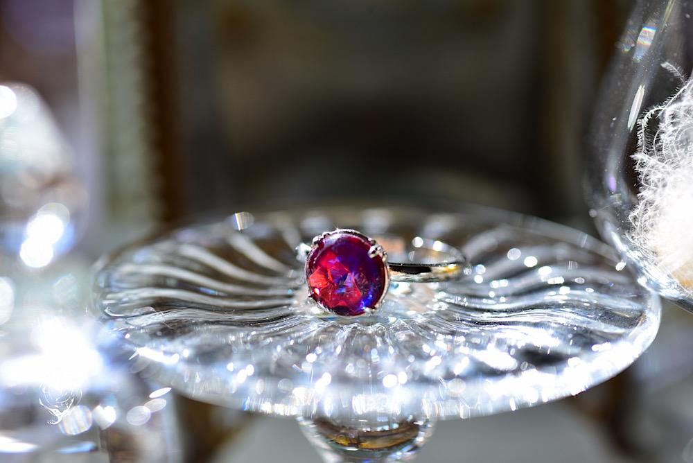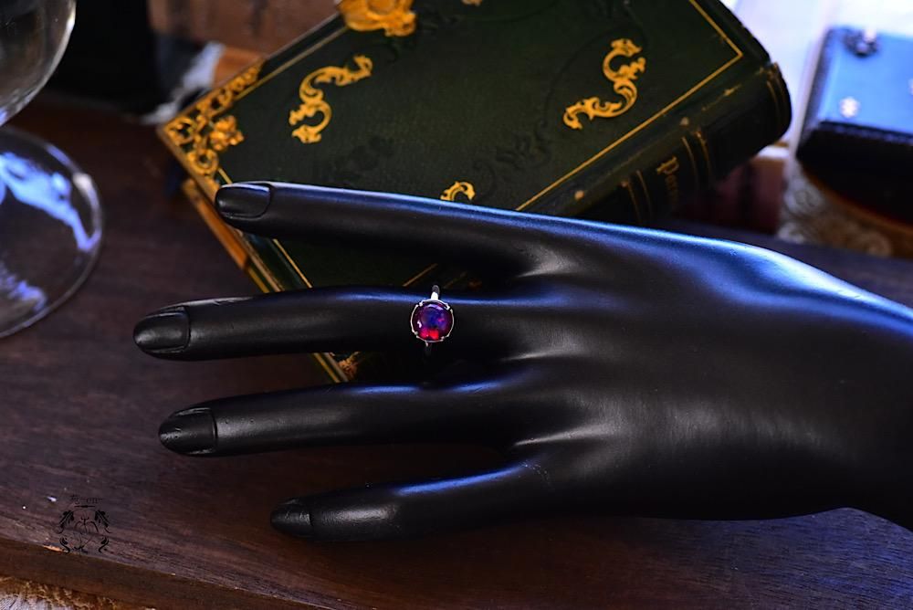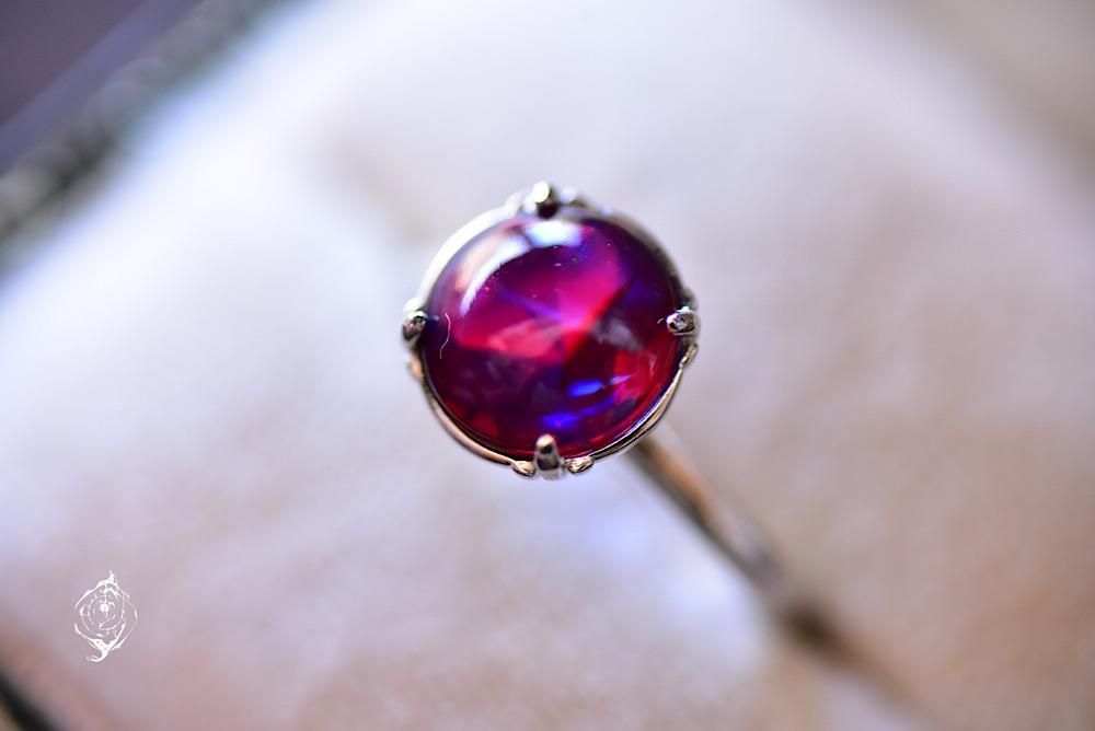 つるんとした大きいサイズのルースに紫の大きなシラーが全面に揺らめく妖艶なドラゴンズブレスを、シンプルなリングに留めました。