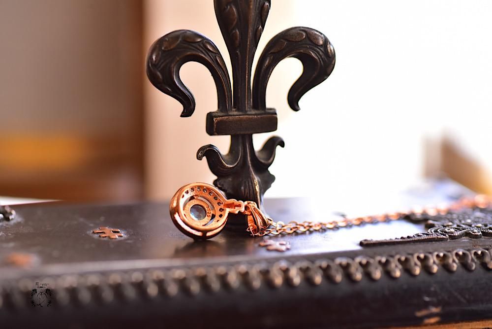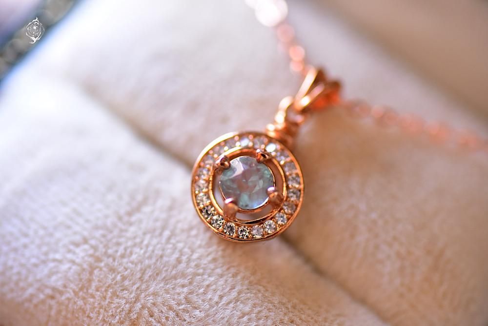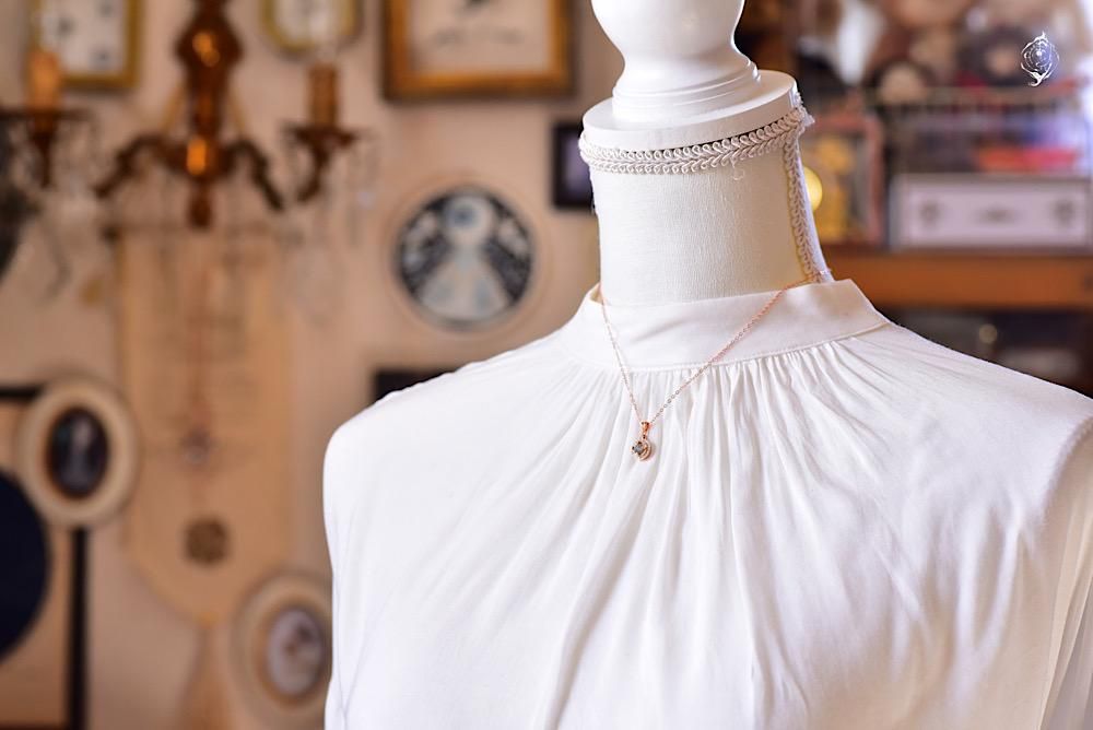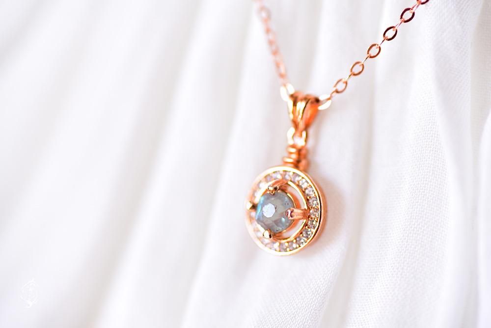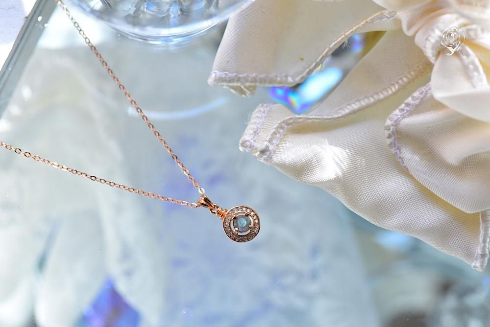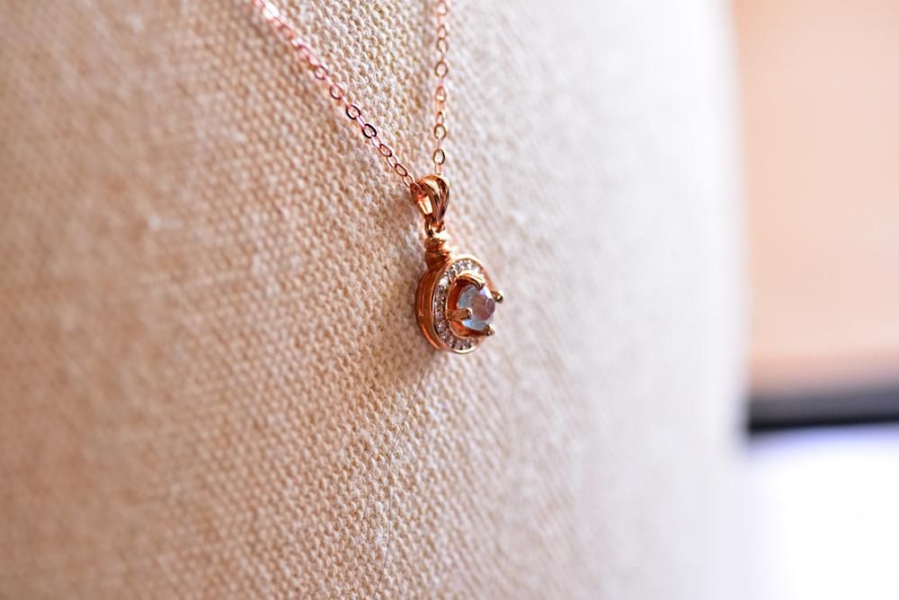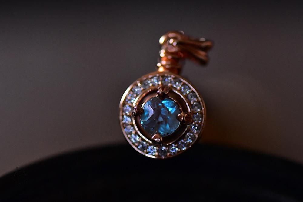まるで懐中時計のようなデザインの枠に、小粒で愛らしいサイズながら青の閃光が瞬くサフィレットを留めてネックレスにしました。