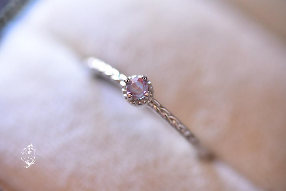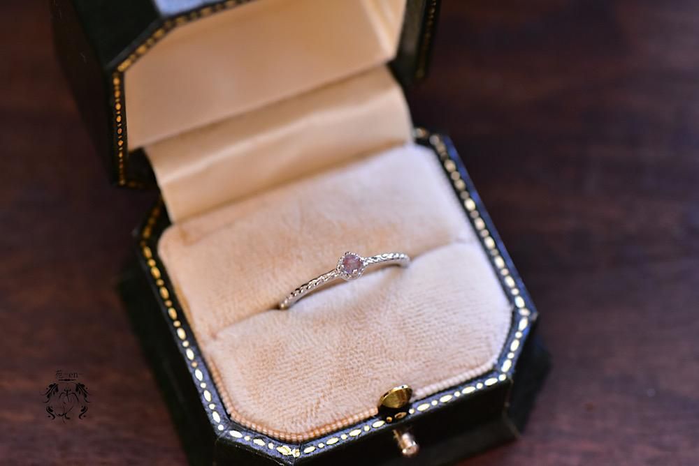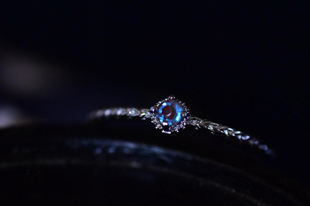 爽やかな青の極小サフィレットを三つ編みのような模様をアームに携え、石座には細かいミル打ちデザインが施された繊細な意匠のリングに留めました。