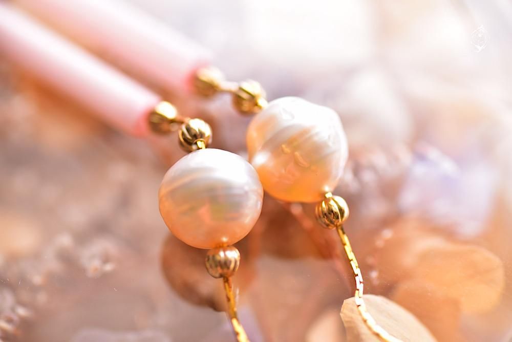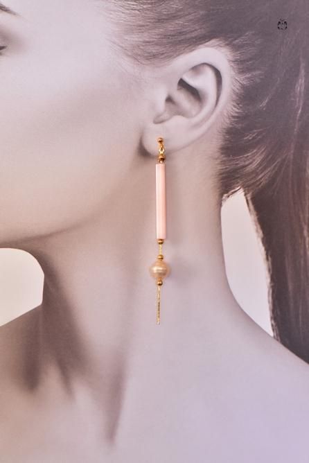 霜柱のような淡いピンクのサテンビーズの下にバロックパールを合わせた耳飾り。