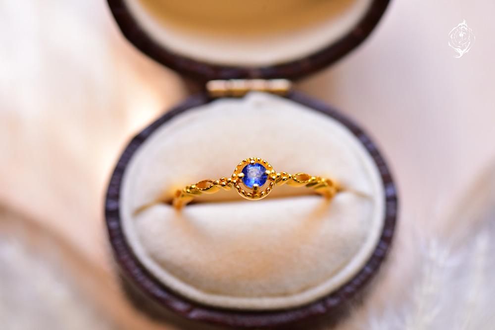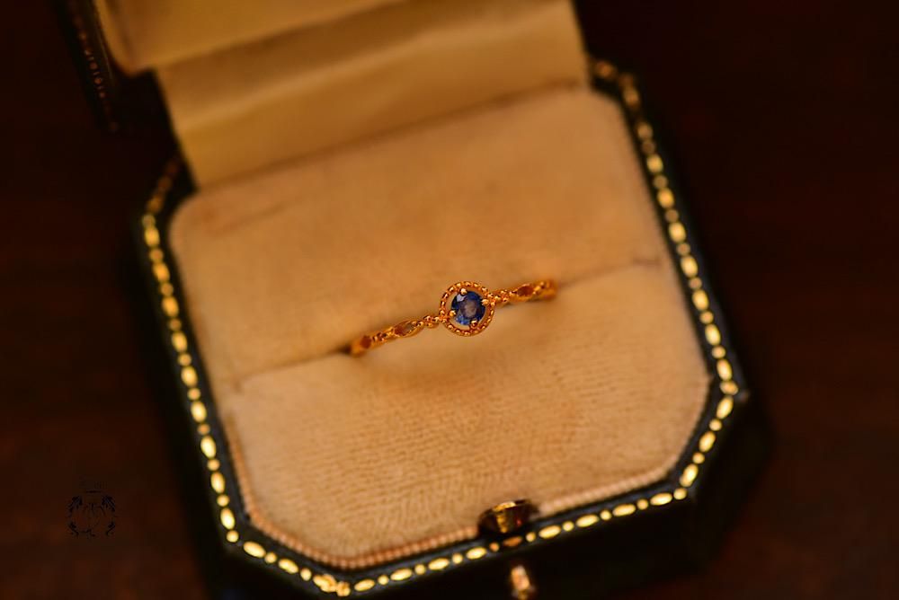濃いブルーのサファイアを華奢なデザインのリングに。
