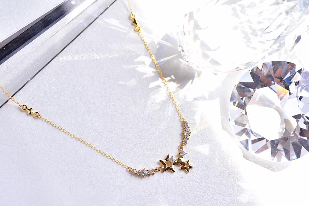 小さなモチーフでネックレスとしては控えめながら、星の連なりは存在感があります。