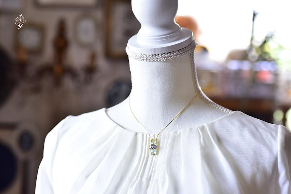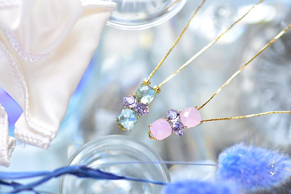 中央のたまご型スワロフスキーはアレキサンドライトカラーで、光源によりラベンダーとライトブルーがお楽しみいただけます。
