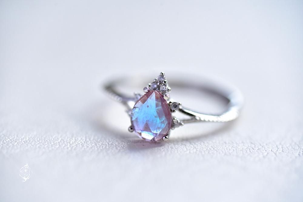 ピンクやブルーが混ざり合う美しいペア型のサフィレットを華奢なデザインのリングに留めました。