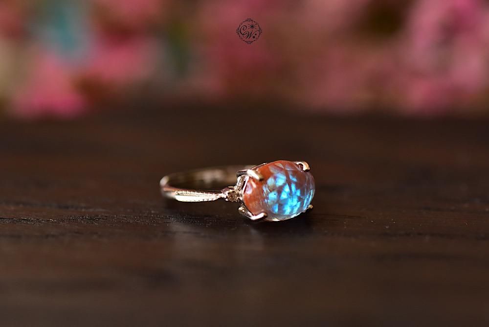 バックフォイルがないルースを使用しているので、背景色が暗いときはレンガ色優勢となり、正面から光を浴びると目を奪われるような洗練された青が見え隠れします。斜めからご覧いただくとうっとりするような色を見せますので、ぜひお気に入りの角度を見つけてください。