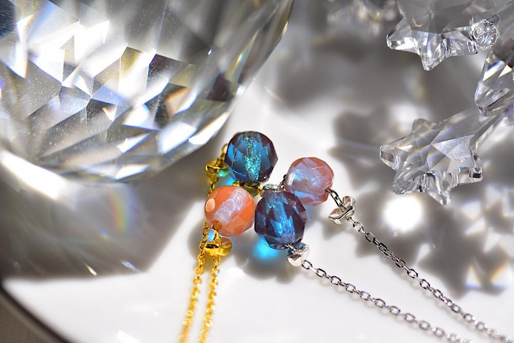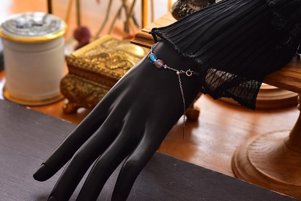深い海のような濃い青とモーブカラー優勢のサフィレットらしいサフィレットビーズを組み合わせたブレスレット。同じガラスなのにこんなに見え方が異なるのかと感嘆のため息をこぼしてしまう組み合わせです。