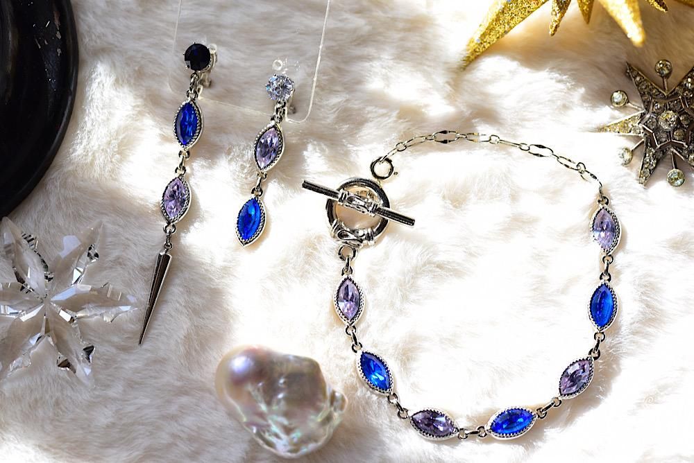 使用したのはスワロフスキーのクリスタルロイヤルブルーディライトとVnt.スワロフスキーのアレキサンドライト。クールな雰囲気のアクセサリーとなっております。