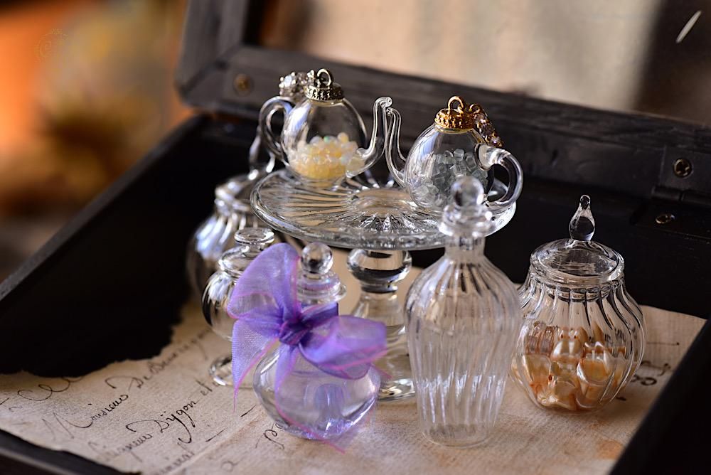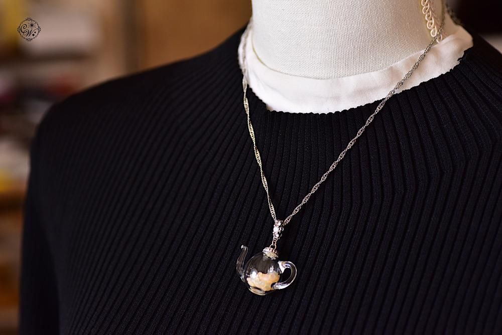 小さなガラスのティーポットに鉱物を詰めたネックレス。