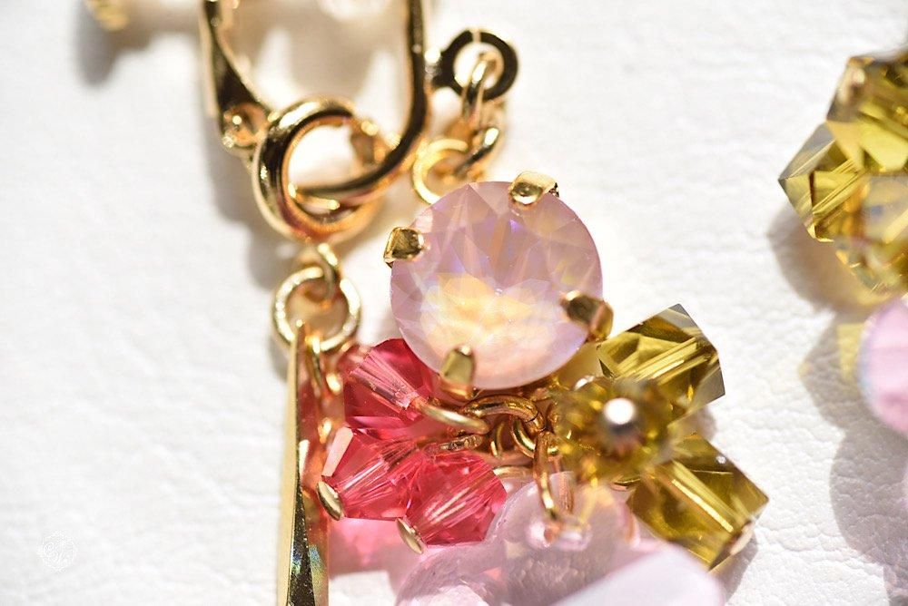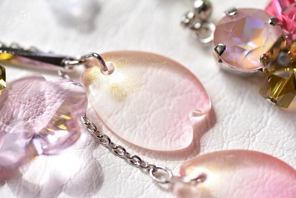スワロフスキーとガラスビーズを組み合わせ、風に乗って花びらが舞う様子をイメージしました。