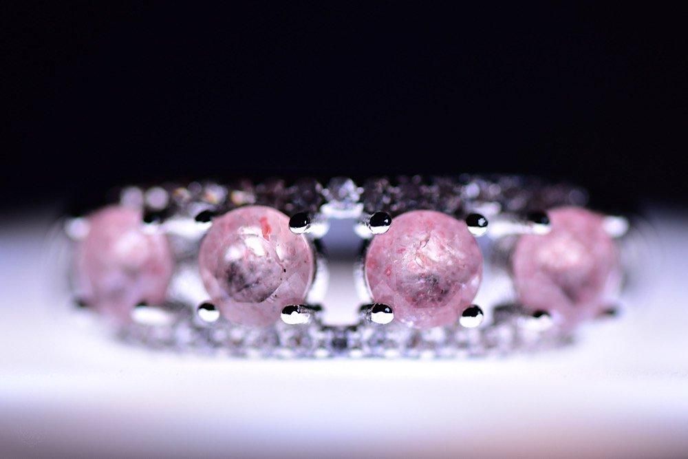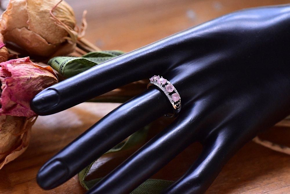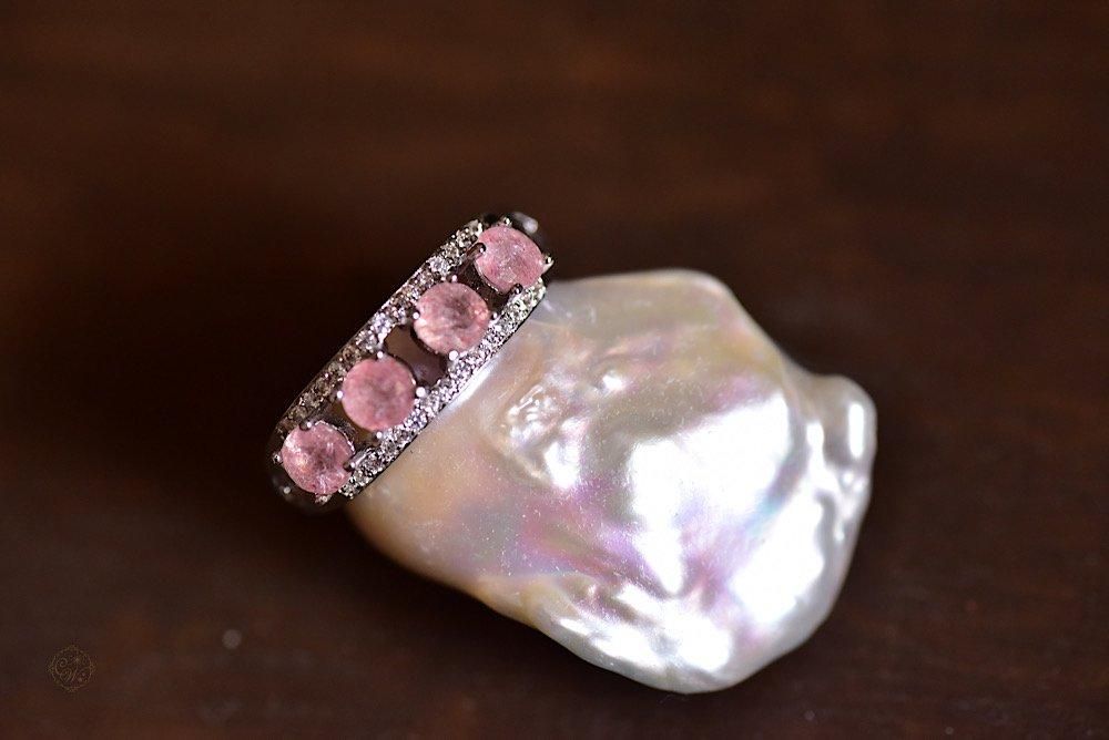 愛らしいストロベリークォーツを指幅いっぱいにお楽しみいただけるハーフエタニティのようなリングに仕立てました。