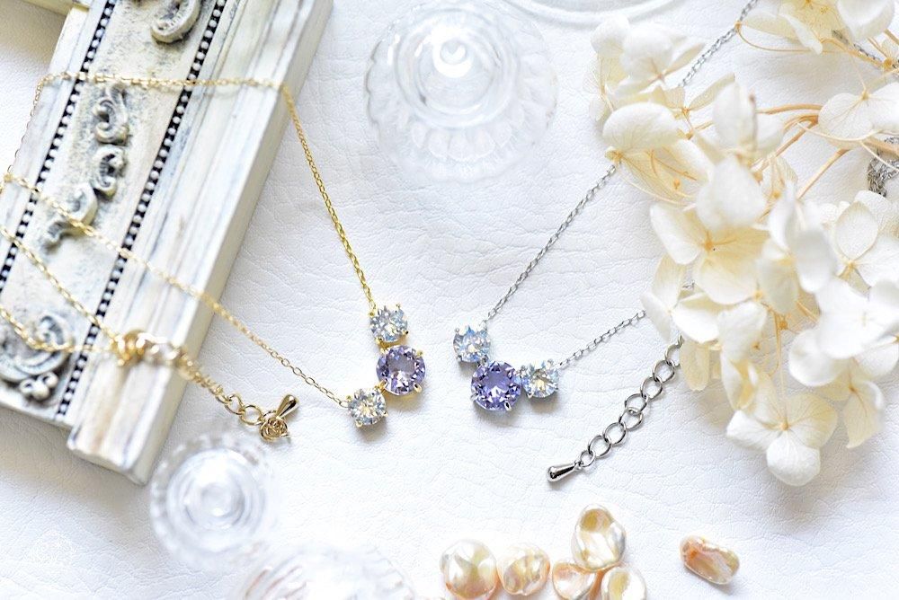 チェーン上にまたがるデザインで、ネックレスとしての一体感があり、両スワロフスキーはおなじように細やかに煌めきます。アレキサンドライトカラーのスワロフスキーはバックフォイルがなく、品よくカラーチェンジします。