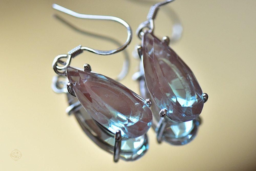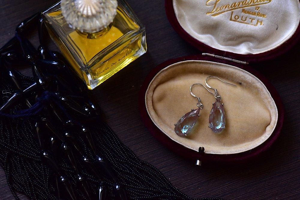 デッドストックだったものなので、全体的に状態は良いです。とはいえアンティークのため、ドロップのトップ部分にごくわずかにチップがあります。ハンドカットによりテーブル面やカット面のサイズが異なります。奥底から湧き出る閃光とモーブカラーは健在で、上品でシックな色合いです。
