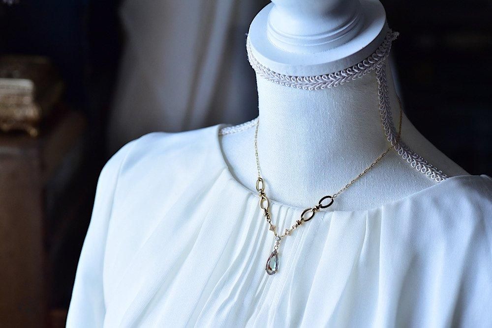 このネックレスを中心にコーディネートをしたくなるようなかわいらしさで、ルースがチェーンと一体化しているからこそ叶うデザインチェーンが目を惹きます。しかしそれに負けない水をまとったようなうるうるとした青。どちらもお互いを引き立て合うお仕上がりです。