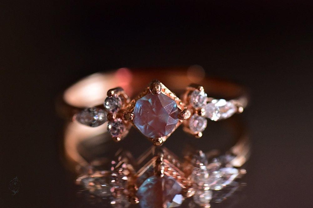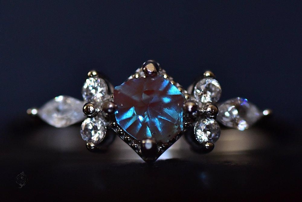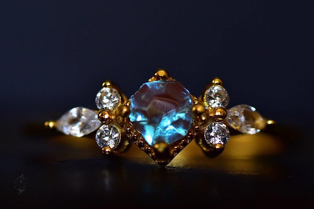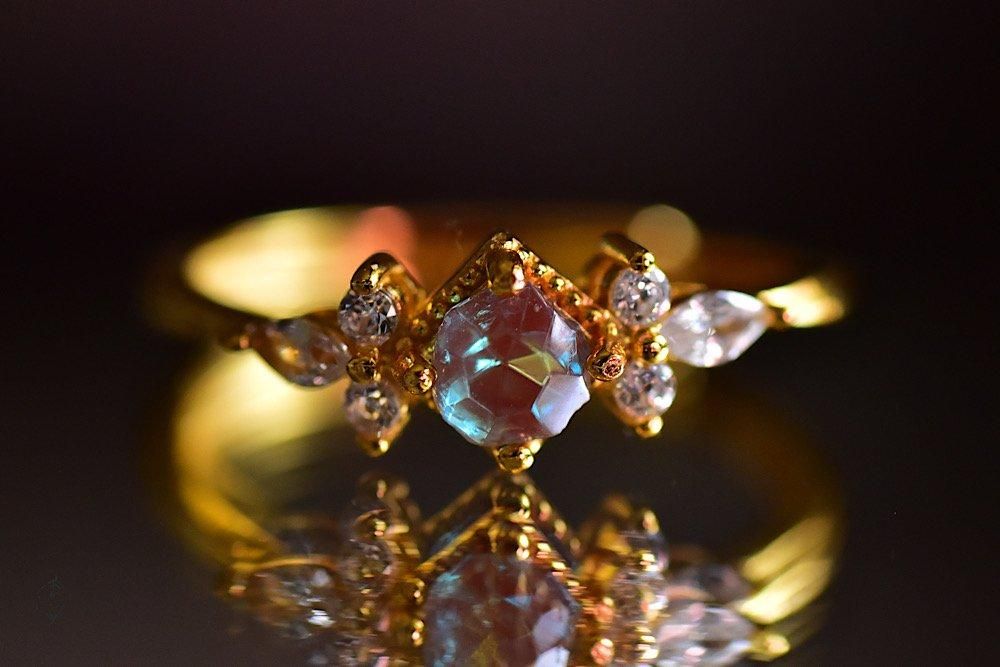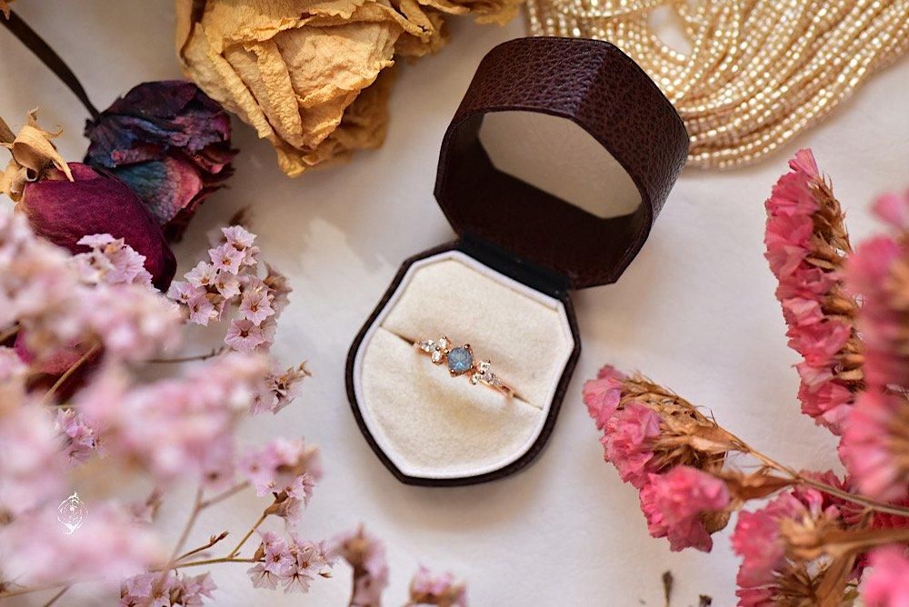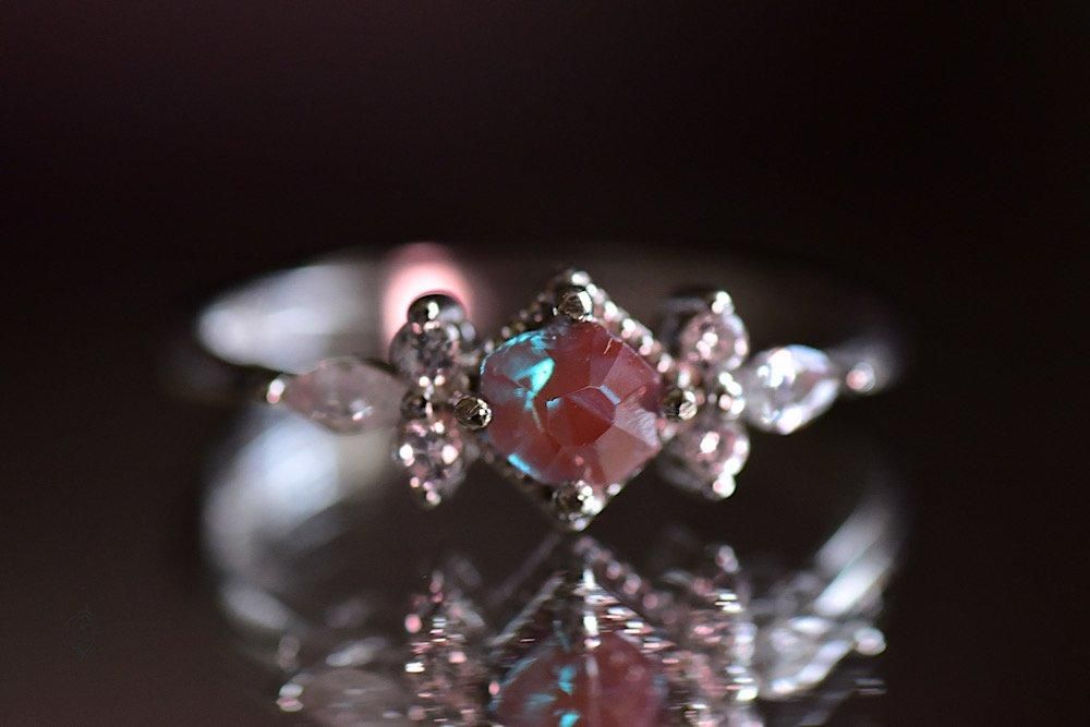 使用したルースは壊れたアンティークのブローチから取り外したサフィレット。ハンドカットでシンメトリーではありません。ルーペで確認しても表面の傷が見当たらない状態の良さです。くもりもないため、ダイレクトに青を堪能できます。