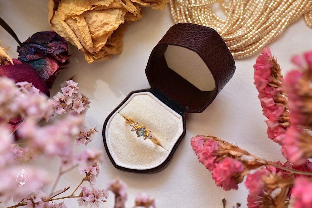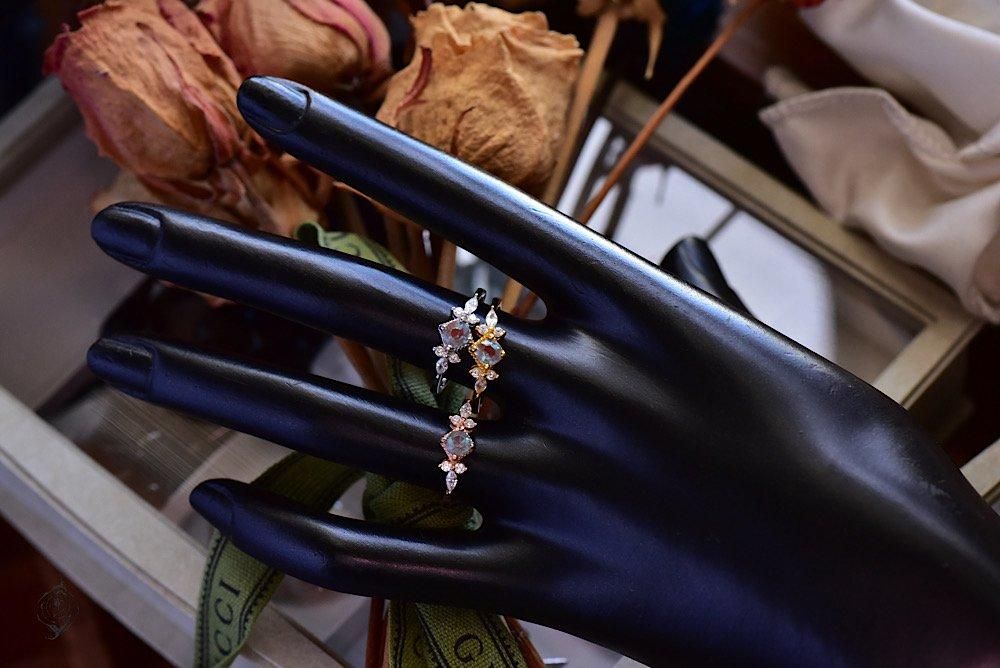 石座の脇にアイビーのようなキュービックジルコニアが輝き、石座周りにはミル打ち風の意匠が施されています。全体的にきらめきが強いですが、モチーフ自体が小さいので普段使いにも最適です。パソコンを打ちながら。ときおり視界に入ると幸せな気分になるリングです。