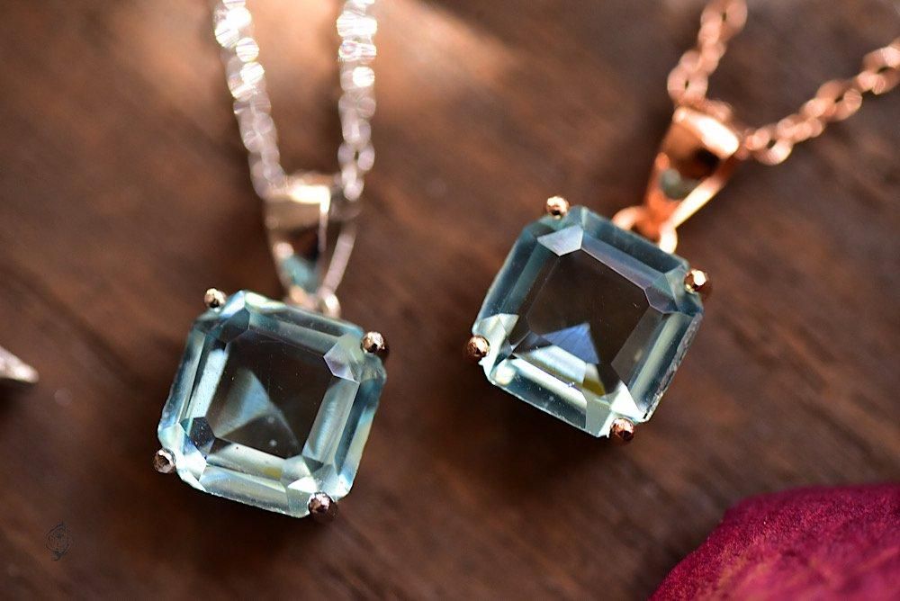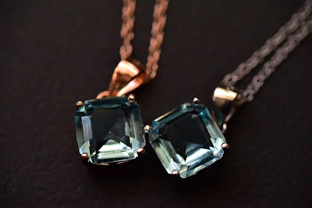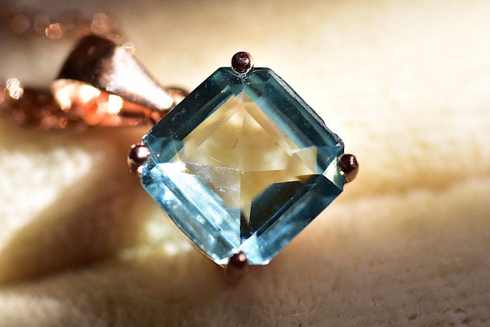 使用したのはヴィンテージのウランガラス。なかなかお目にかかれない水色のルースです。UVライトを照射すると、優しいネオングリーンに蛍光します。ハンドカットの愛らしさを堪能できるステップカットで、輝きすぎない上品さがあります。掲載したアップの画像では、シルバーカーラーのルースに気泡が見えますが、肉眼だとほとんど気が付かないレベルのものです。側面のエッヂ部分は多少のダメージはあるものの、正面からの見え方には影響していません。