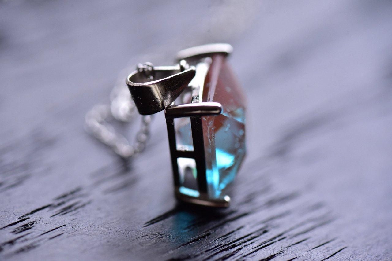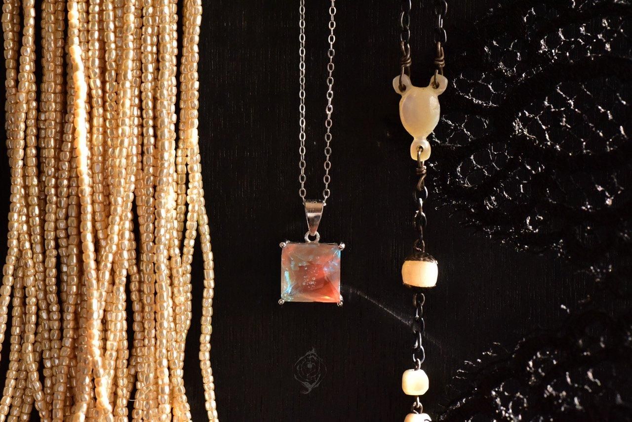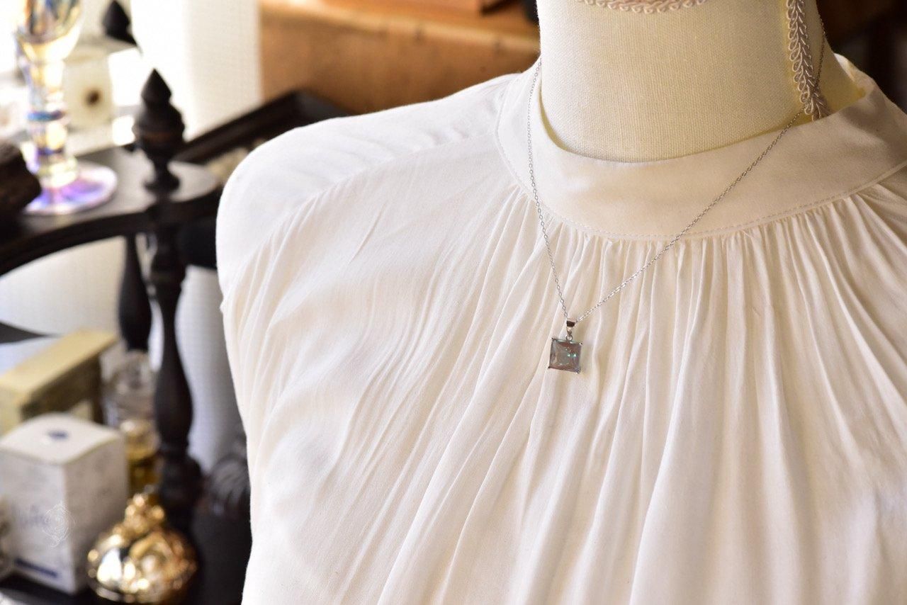 パッと目を惹くサイズ感のネックレス。スクエアなのでユニセックスに使いやすいデザインです。正面から見たときにルースだけが見えるよう、シンプルな石座を採用しました。付属のチェーンを外してお持ちのロングチェーンや革紐につけかえても合うのでおすすめです。
