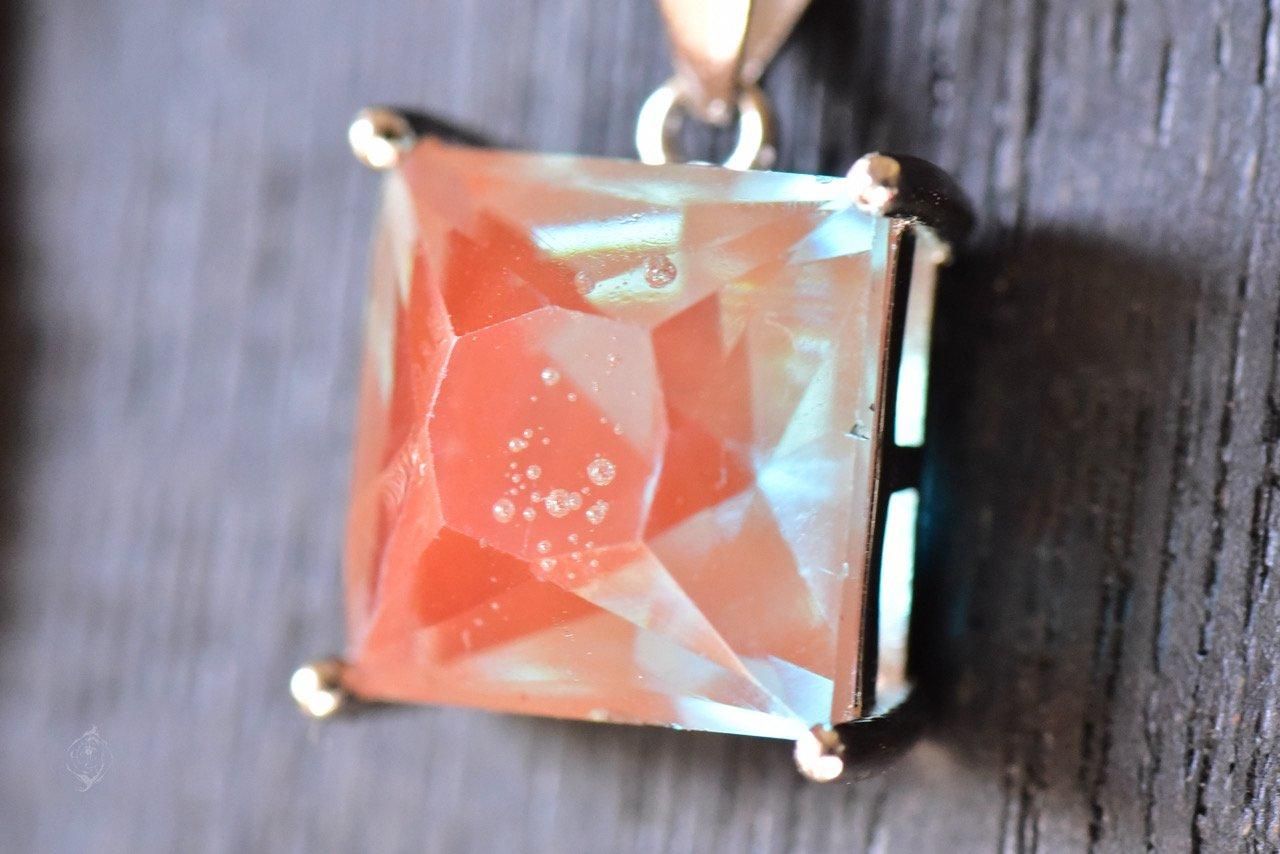 使用したのは、対角13mmのスクエアサフィレット。中央のテーブル面から放射線状にカットされたルースで、内部に気泡があります。一部大きめに剥離した跡がありますが、白くなっていないため、目立ちません。よく観察しないと気になりませんが、感じ方には個人差がありますので画像にてご確認の上でお求めください。色もしっかりと青がでていて美しいルースです。スクエアカットによくある切れのある輝きが印象的です。