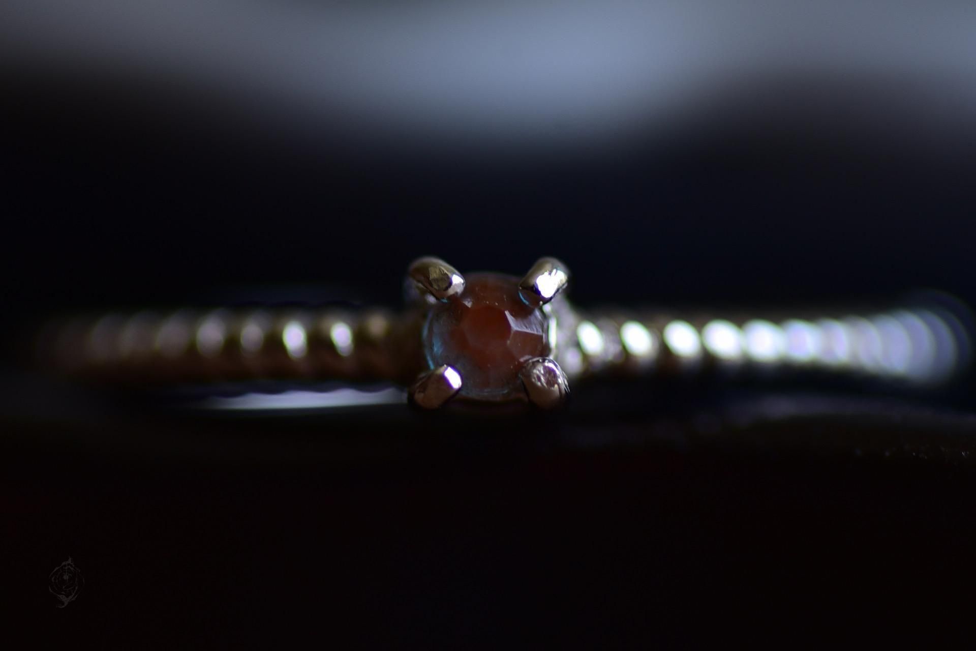 使用したのは、2mmととっても小さなサフィレット。テーブル面が小さく、高さのあるルースです。欠けやチップはほとんどない状態の良さですが、ルーペで確認するとわずかに黒点があります。ルース自体がとても小さいので肉眼ではまったくわかりません。