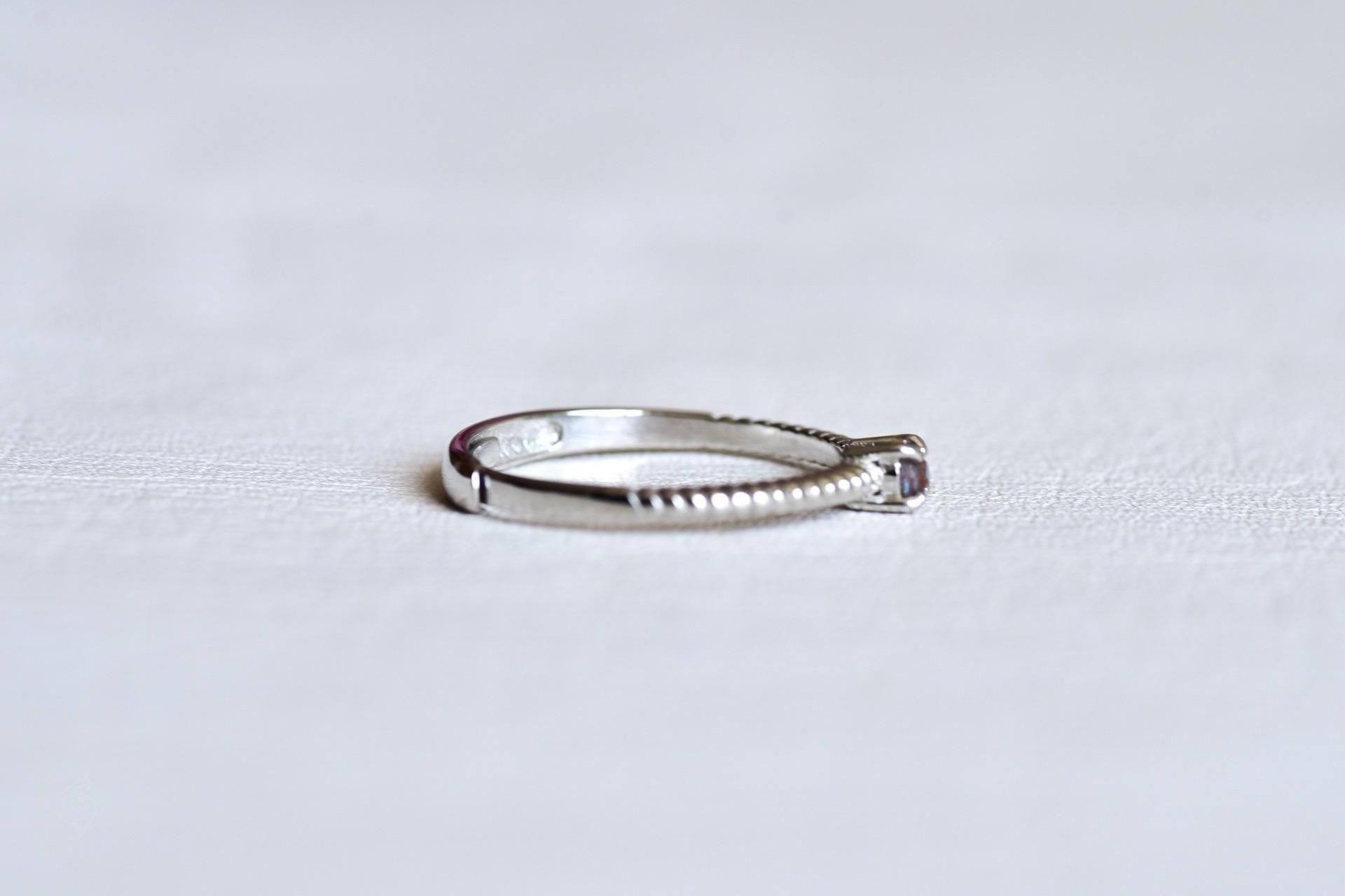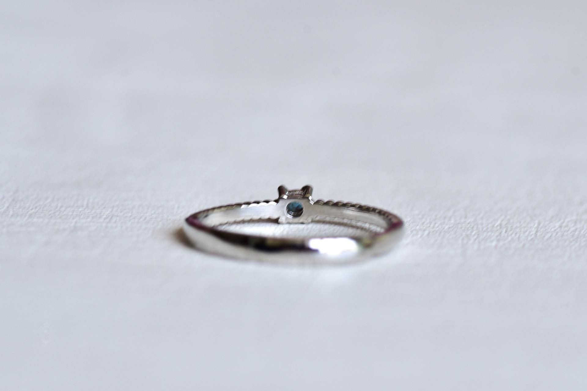 非常に濃い青のルースですが、リングのデザイン上、常にギラギラ輝くわけではなく普段は落ち着きのある印象。傾けたときや落ちる影に美しい青が姿をあらわす控えめなサフィレットです。