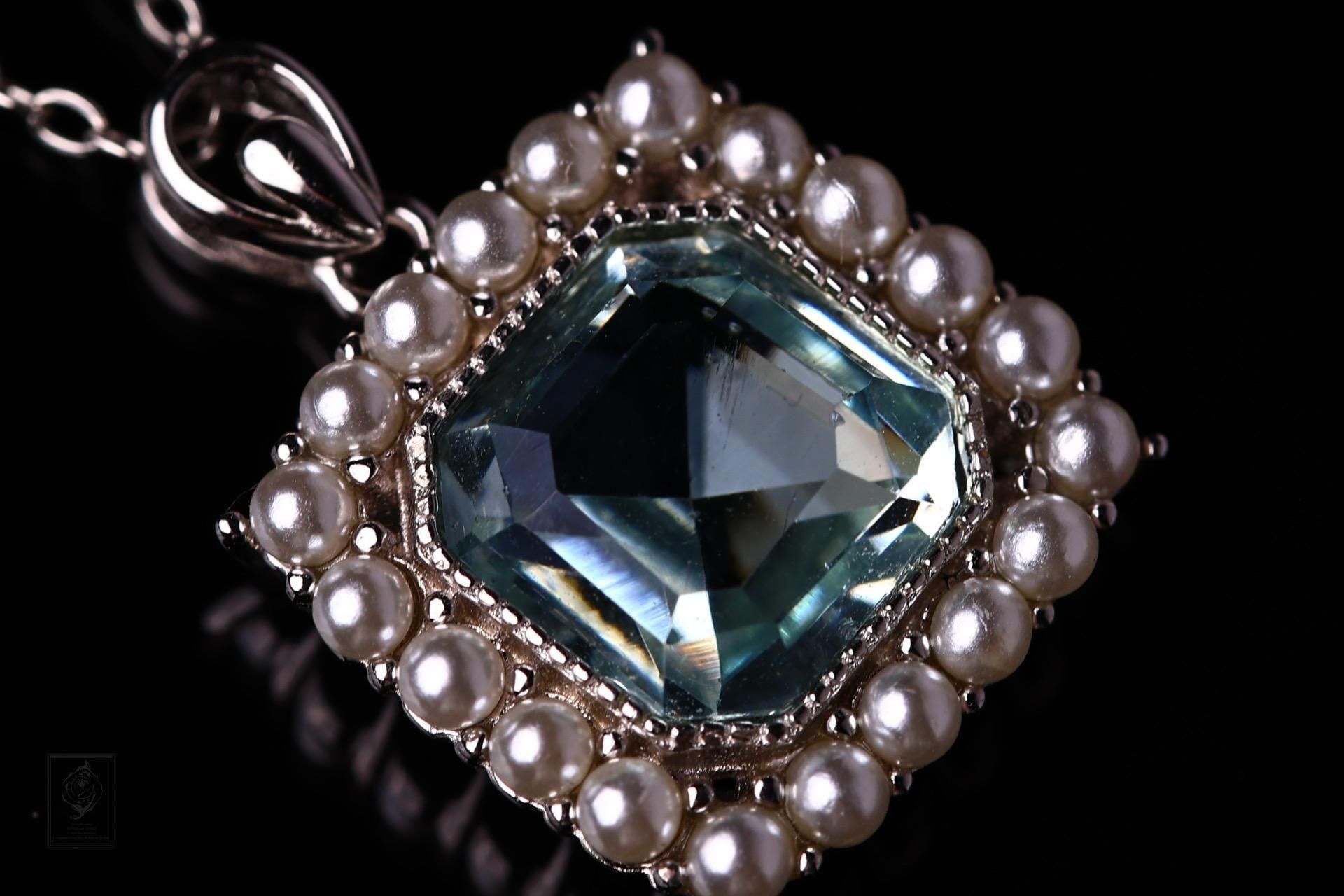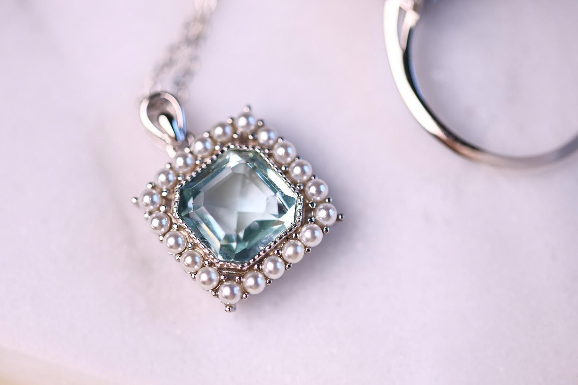 ヴィンテージのウランガラスを、天然のシェルパールでぐるりと囲った