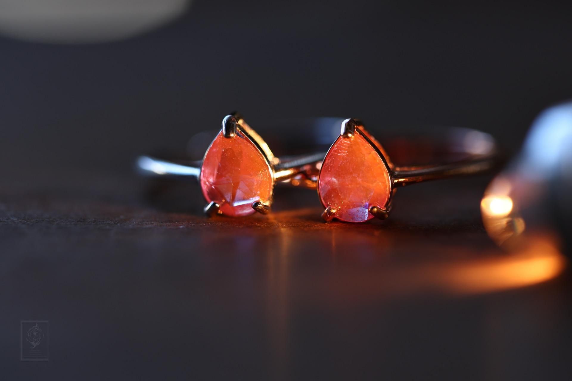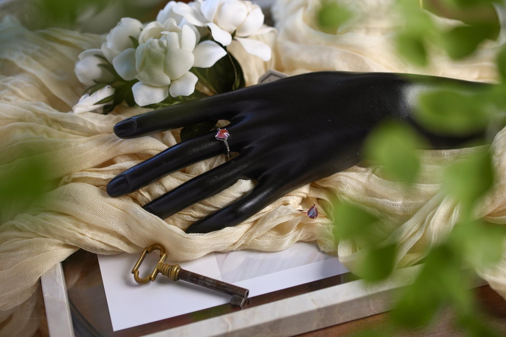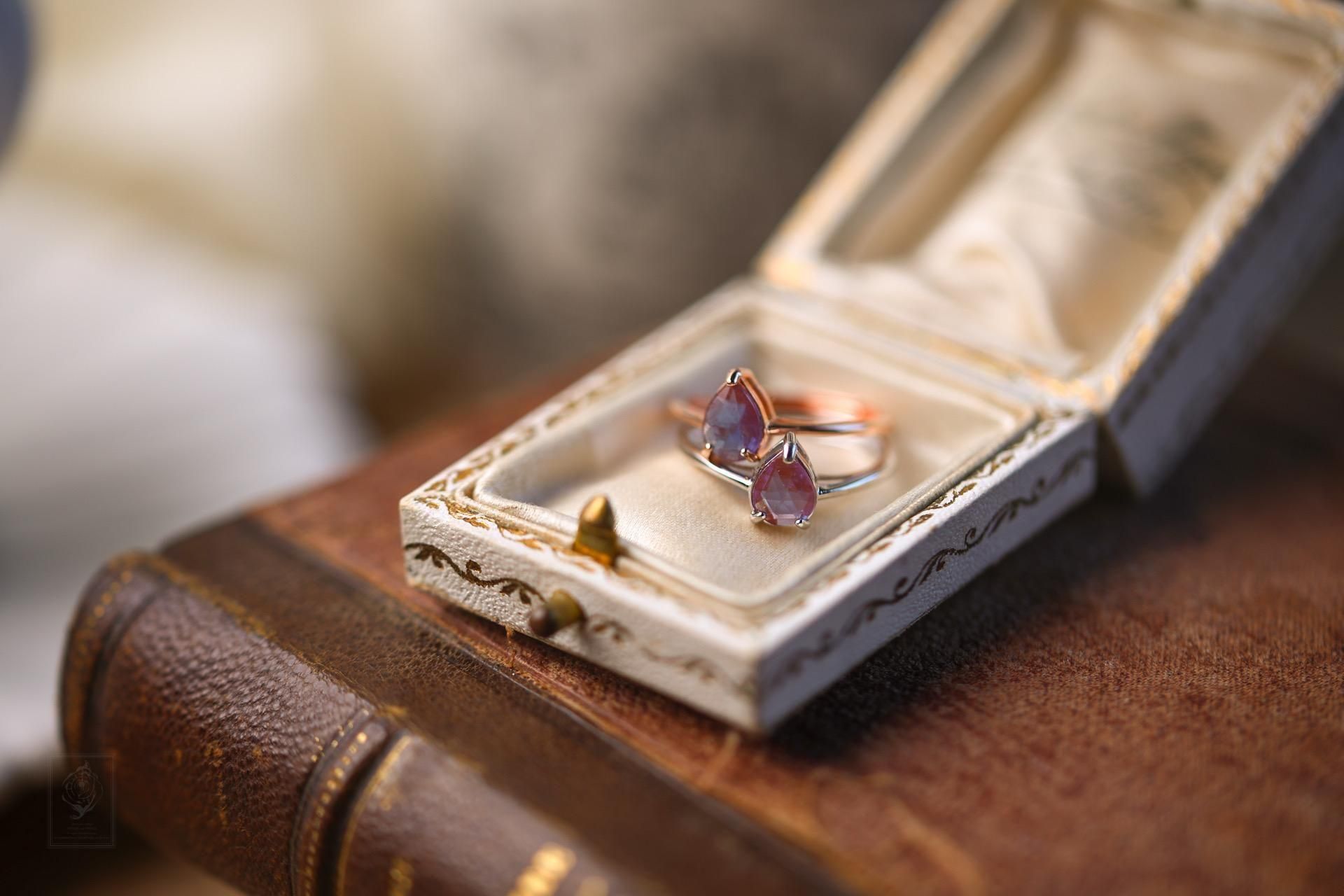 使用したのは、Carino worksで何度も完売しているローズカットのPear型サフィレット。厚みが薄く、ぎらっとした閃光はないものの、個体ごとに豊かな色彩をもつことが特徴です。