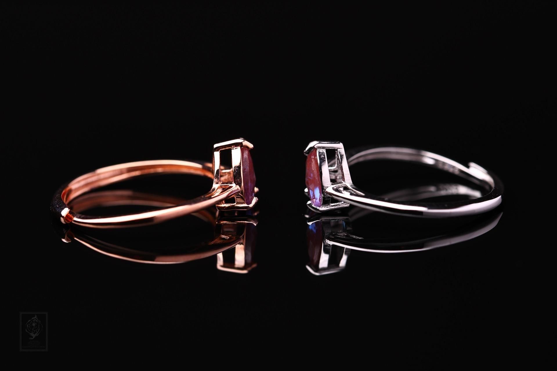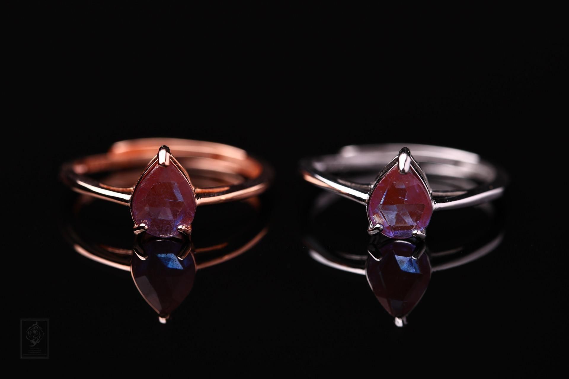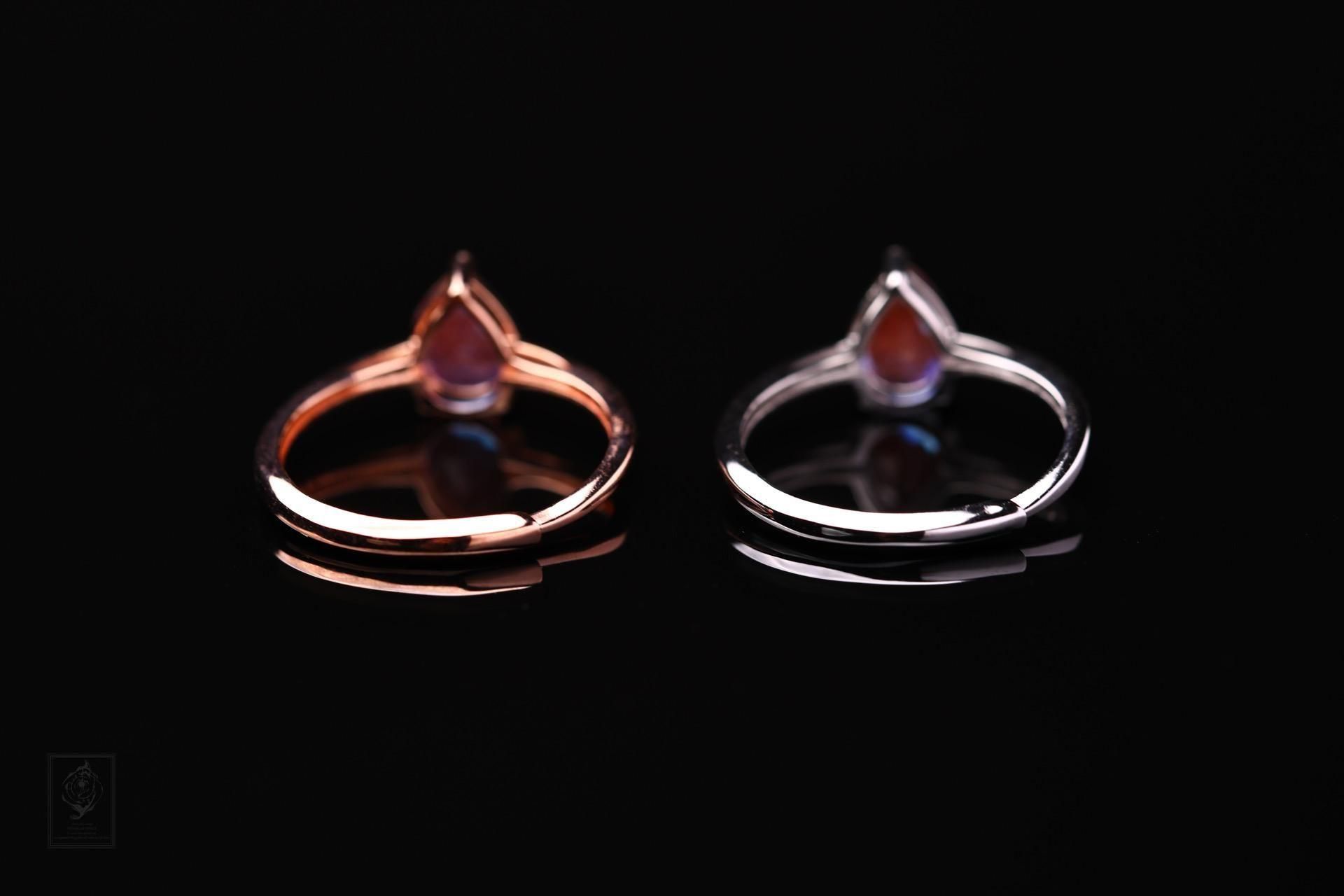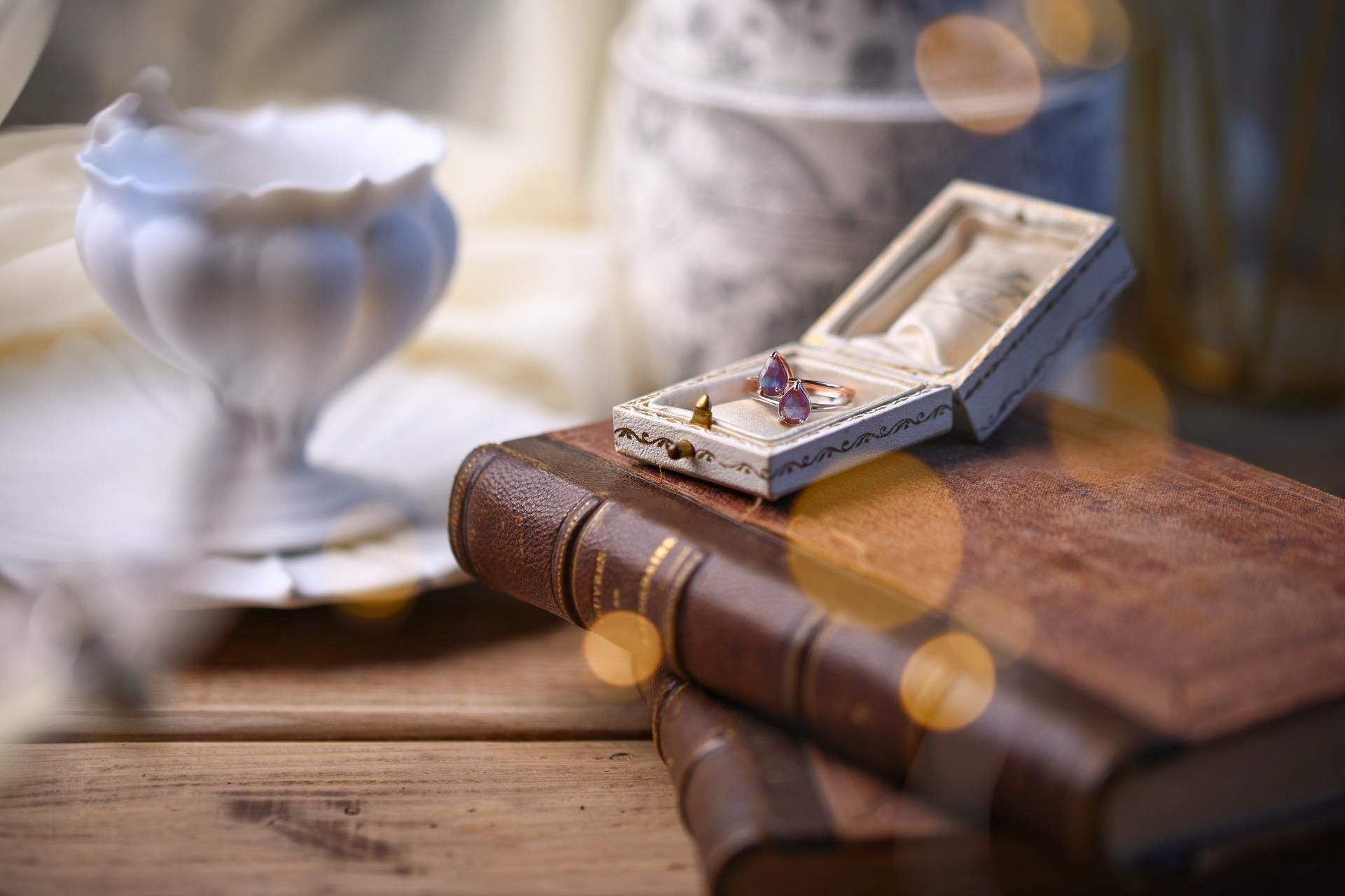 使用したのは、Carino worksで何度も完売しているローズカットのPear型サフィレット。厚みが薄く、ぎらっとした閃光はないものの、個体ごとに豊かな色彩をもつことが特徴です。